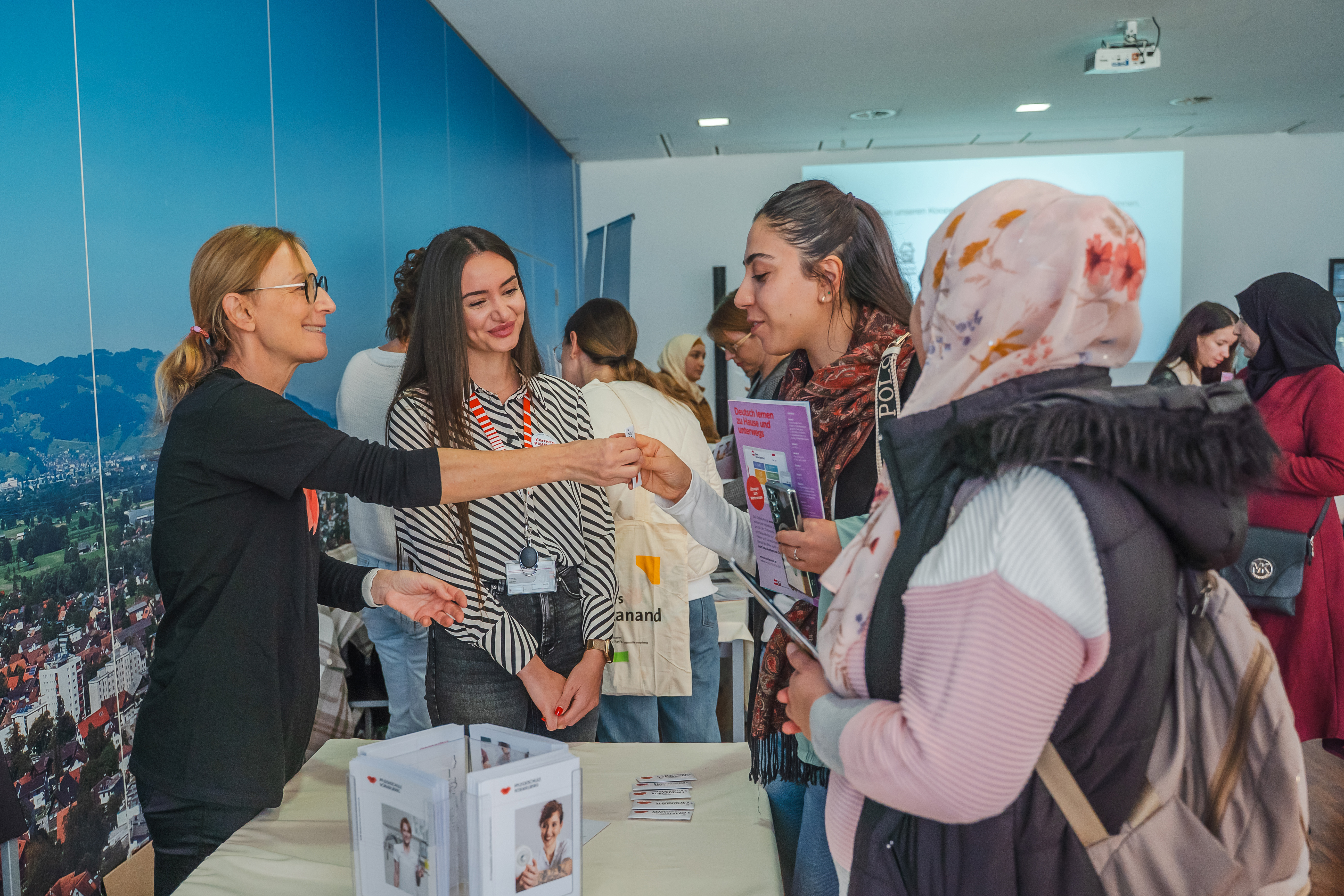 Die BesucherInnen – Asyl- und subsidiär Schutzberechtigte sowie ukrainische Vertriebene, die derzeit Deutschkurse beim ÖIF besuchen – nahmen in Zusammenarbeit mit Partnerorganisationen wie der Hauskrankenpflege Vorarlberg, der Pflegeschule Vorarlberg, Mobile Hilfsdienste, BIFO – Beratung für Bildung & Beruf, Connexia – Gesellschaft für Gesundheit & Pflege, Berufsförderungsinstitut (BFI) und Lebenshilfe Vorarlberg die Gelegenheit wahr, sich über offene Stellen sowie Aus- und Weiterbildungsmöglichkeiten im Gesundheits- und Pflegebereich zu informieren. Sie konnten vor Ort Gespräche mit RecruiterInnen führen, sich auf offene Stellen bewerben oder ein Bewerbungsgespräch vereinbaren. Der ÖIF informierte zu berufsbegleitenden Deutschlernangeboten und unterstützte die TeilnehmerInnen mit CV-Checks beim Verbessern ihres Lebenslaufs.