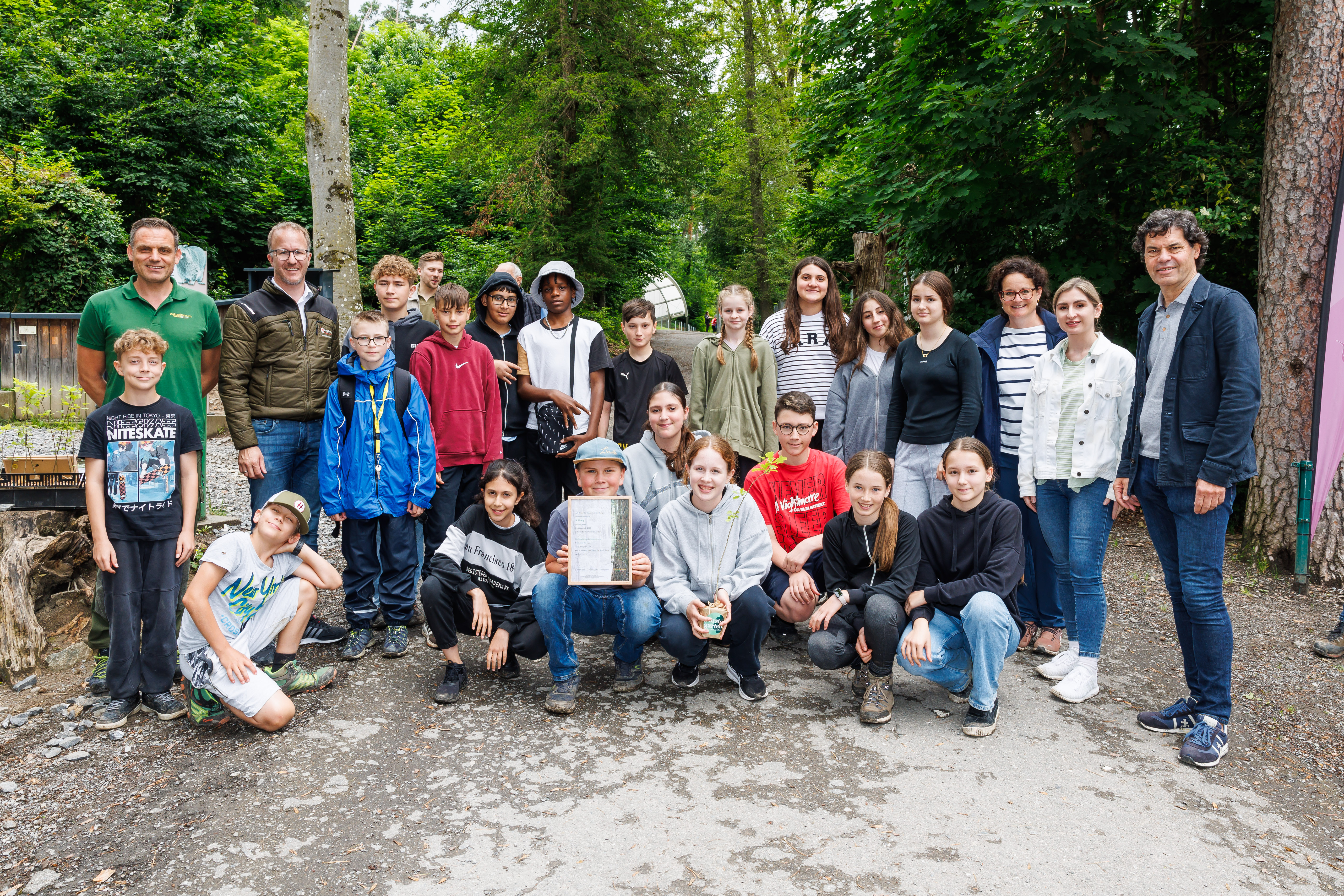 Feldkirch (VLK) – Nach fünfjähriger Pause gab es heute (Montag, 1. Juli) einen gelungenen Neustart der traditionellen Waldspiele am Ardetzenberg in Feldkirch. Zahlreiche Schulklassen aus dem ganzen Land mit insgesamt fast 200 SchülerInnen bewiesen Wissen, Geschicklichkeit und Können im Zusammenhang mit dem Wald. Forstlandesrat Christian Gantner gratulierte allen Teilnehmenden und unterstrich die pädagogische Bedeutung der Waldspiele: „Der Wald mit seinen vielfältigen natürlichen Funktionen ist von den Veränderungen des Klimas sehr stark betroffen, zugleich aber ein wichtiger Teil der Lösung. Daher ist die Waldpädagogik ein wichtiger Baustein der Vorarlberger Waldstrategie 2030+. Es geht darum, schon in der Schule den sorgsamen Umgang mit sensiblen Ökosystemen zu vermitteln, um das Naturbewusstsein in unserer Gesellschaft nachhaltig zu stärken.“
