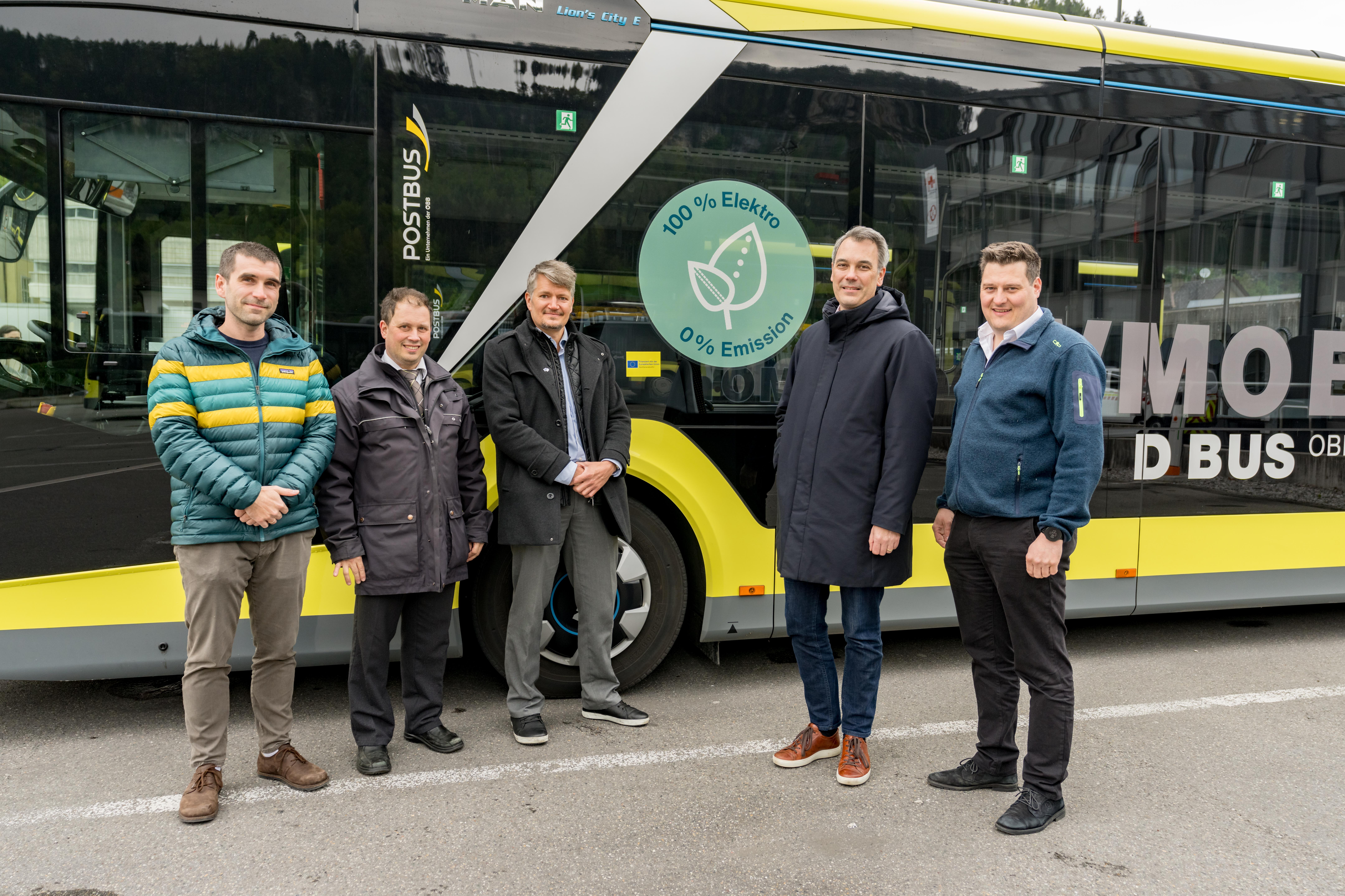 (v.l.n.r.) Leonard Lechner (Projektleiter Dekarbonisierung, VVV), Bernhard Speckle (Verkehrsdisponent, Postbus AG), Tim Joris Kaiser (Vertretung der Europäischen Kommission in Österreich), Christian Hillbrand (GF, VVV) und Mathias Schönherr (Verkehrsleiter, Postbus AG).