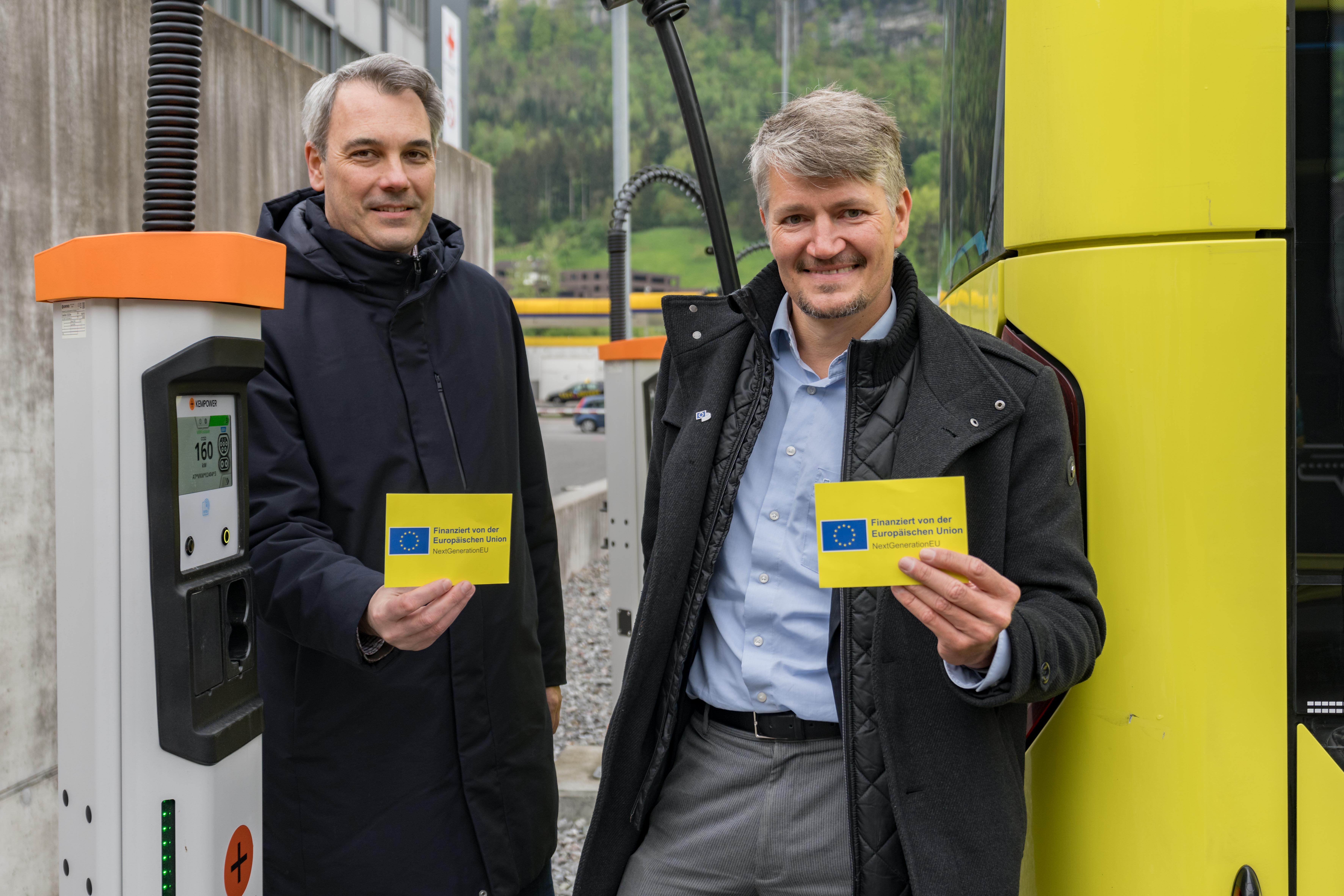 Tim Joris Kaiser, Mitarbeiter der Vertretung der Europäischen Kommission in Österreich, machte sich am Montag (22. April) bei einem Besuch beim Verkehrsverbund Vorarlberg in Feldkirch ein Bild vom Einsatz dieser Mittel, die in das Projekt EBIN (Emissionsfreie Busse und Infrastruktur) des Bundesministeriums für Klimaschutz, Umwelt, Energie, Mobilität, Innovation und Technologie fließen und von dort zu großen Teilen zu VERDE nach Vorarlberg wandern. „Mit den Fördermitteln von NextGenerationEU werden gezielt Initiativen unterstützt, die den grünen Wandel vorantreiben. Die E-Busse in Vorarlberg sind ein Vorzeigeprojekt in diesem Bereich.“ 56 Prozent der NextGenerationEU-Gesamtmittel von fast vier Milliarden Euro für Österreich sind für Maßnahmen zur Erreichung der Klimaschutzziele vorgesehen, davon 256 Millionen Euro für das Projekt EBIN.