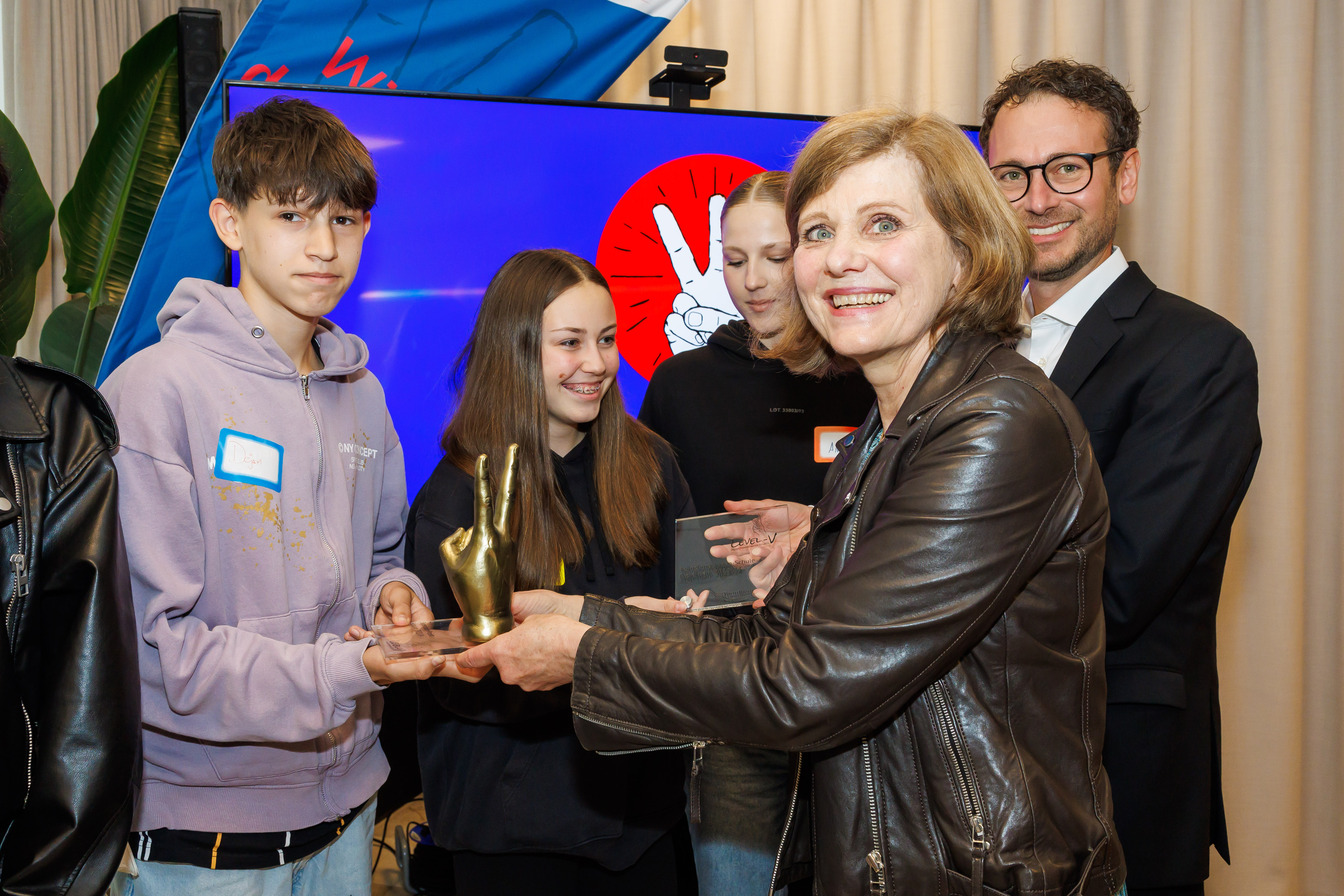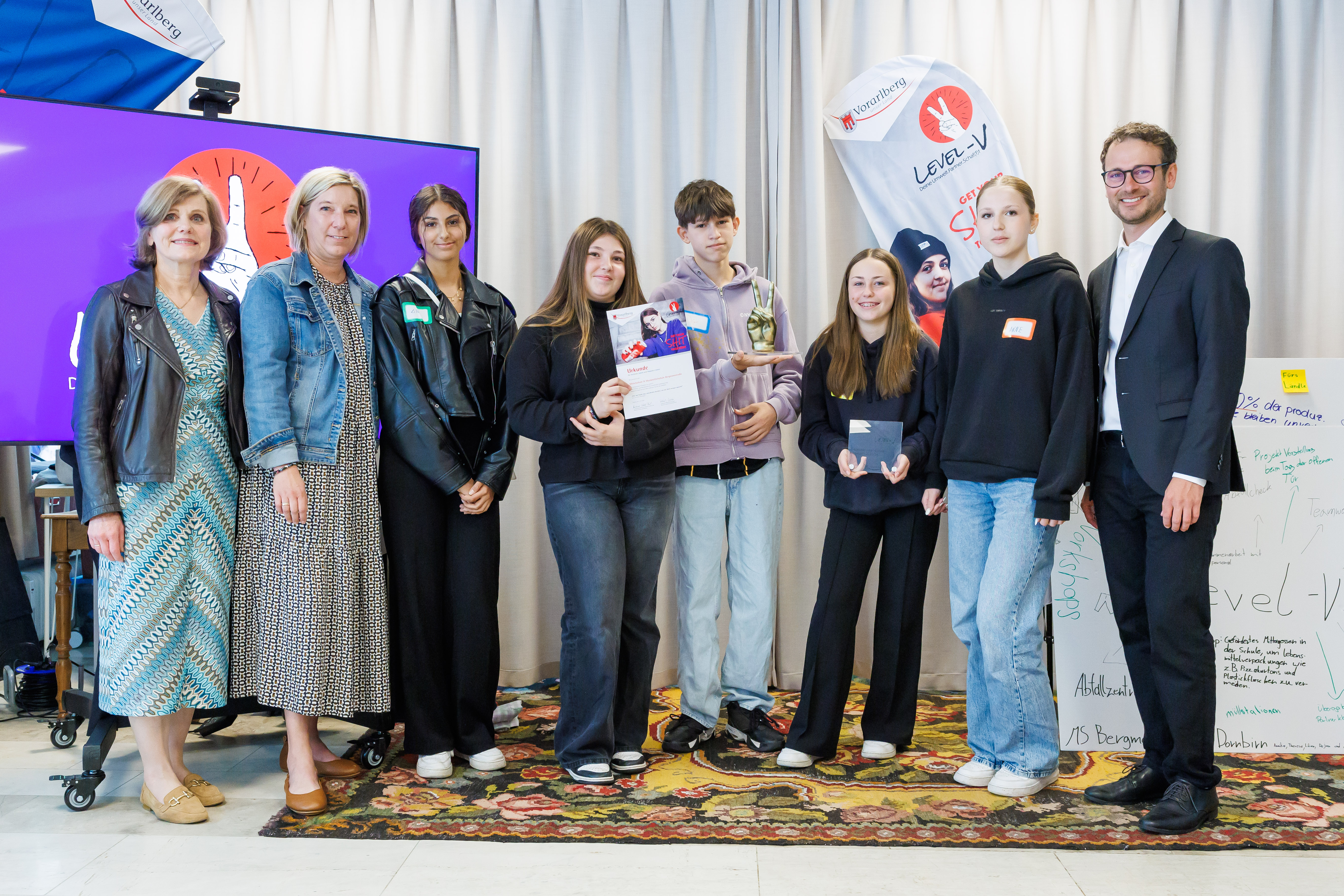 Landesstatthalterin Schöbi-Fink und Landesrat Zadra überreichten Urkunden an die teilnehmenden Schulen. Die Mittelschule und Musikmittelschule Dornbirn Bergmannstraße ist Landessieger. Zwei Anerkennungspreise gingen an das Bundesgymnasium Bregenz Blumenstraße und die Mittelschule Lustenau Hasenfeld.