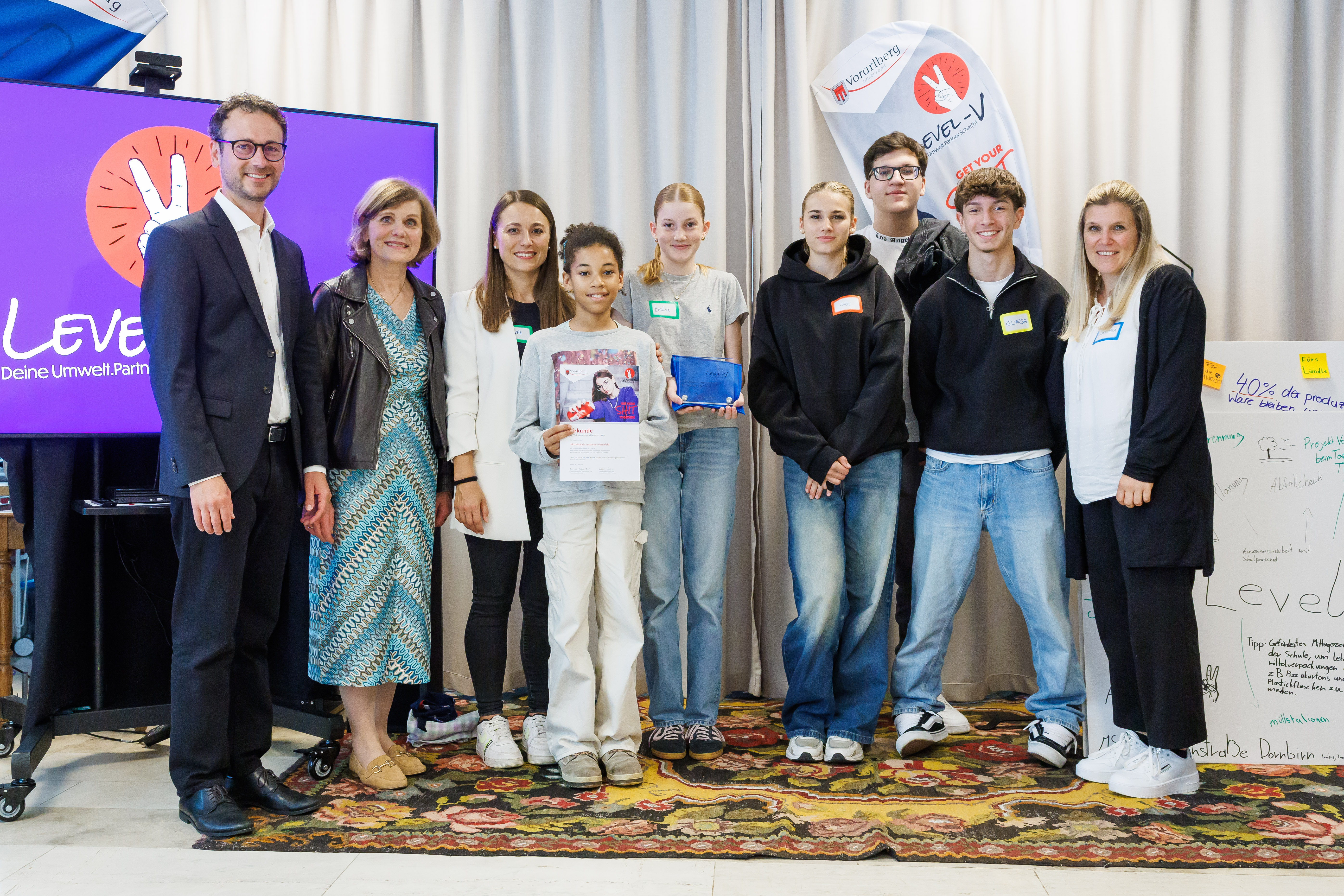 Dornbirn (VLK) – Mit „Level-V“ hat das Land Vorarlberg eine Initiative gestartet, die sich an die Zielgruppe der 10- bis 18-jährigen SchülerInnen wendet. „Mit dieser Initiative unterstützen wir SchülerInnen in Vorarlberg, die aktiv etwas für den Umwelt- und Klimaschutz bewirken wollen“, informierten Landesstatthalterin Barbara Schöbi-Fink und Landesrat Daniel Zadra bei der heutigen (7. Juni) Preisverleihung in Dornbirn. Zwölf Schulklassen haben dieses Programm abgeschlossen. Die Mittelschule und Musikmittelschule Dornbirn Bergmannstraße ist Landessieger. Zwei Anerkennungspreise gingen an das Bundesgymnasium Bregenz Blumenstraße und die Mittelschule Lustenau Hasenfeld.