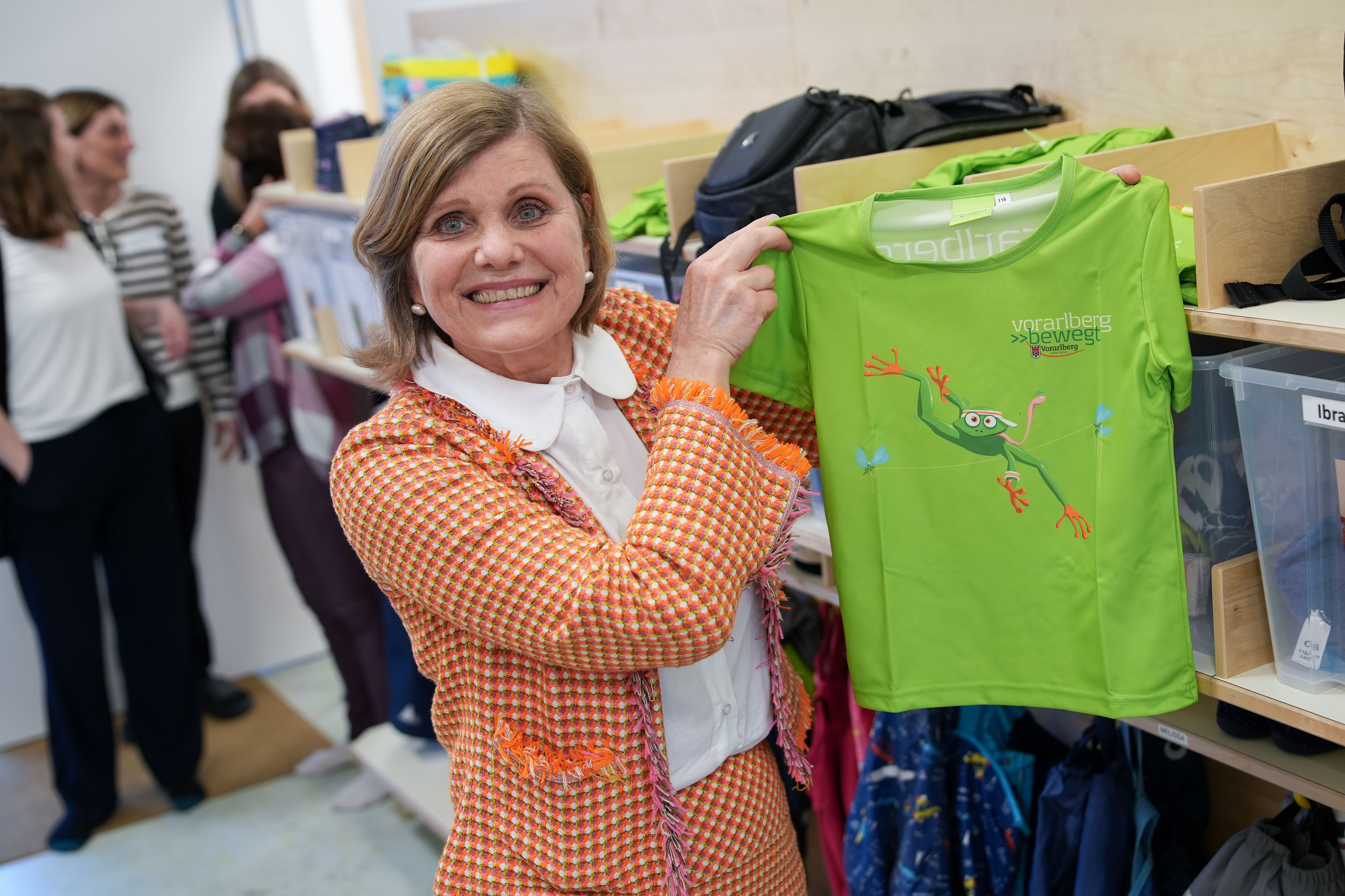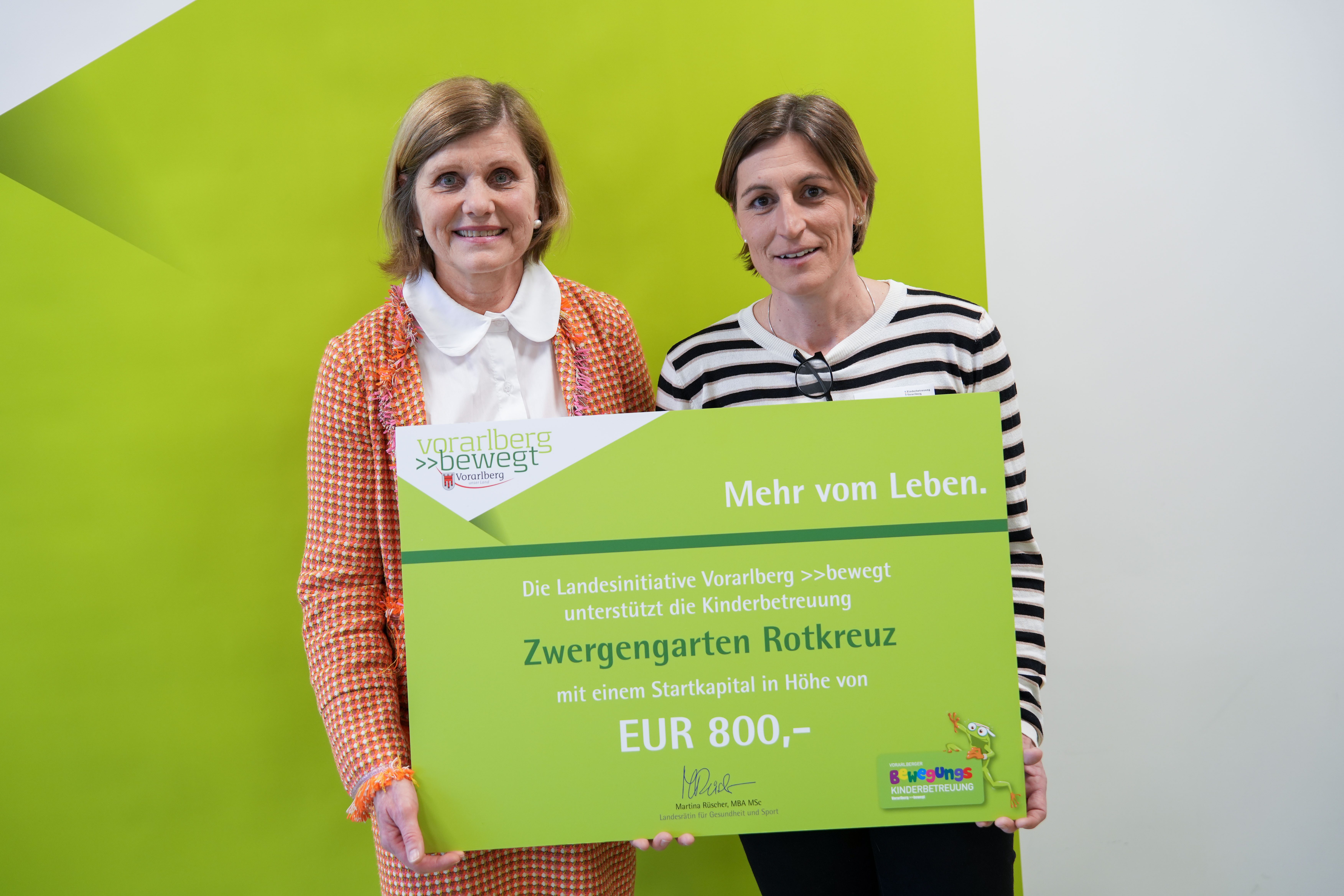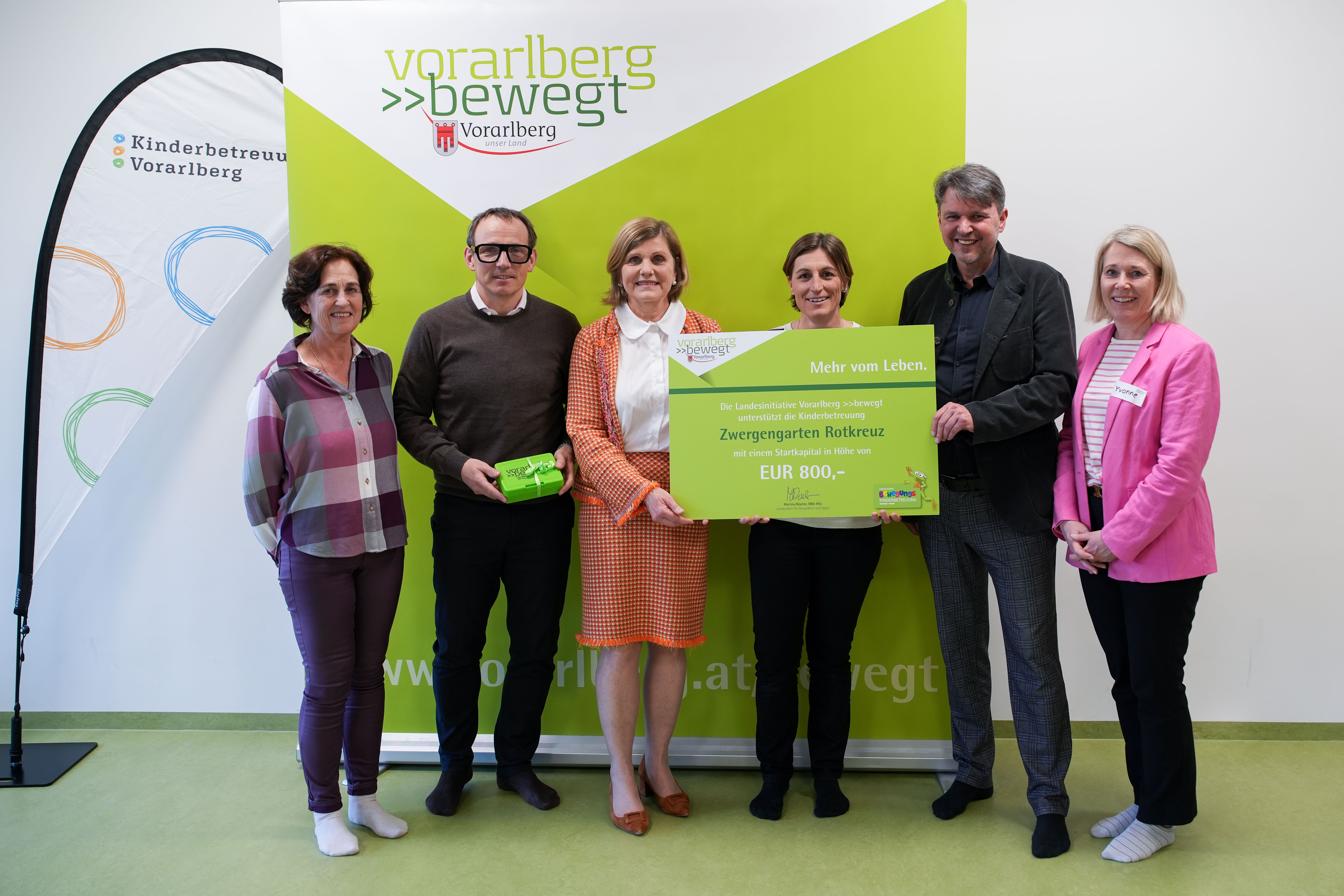 Als Anerkennung für die wertvolle Arbeit überreichte Landesrätin Schöbi-Fink der Leiterin Karin Bösch und ihrem Team einen Scheck über 800 Euro. Die Mittel sollen in neue Bewegungsmaterialien und Spiele investiert werden, um die Kinder spielerisch weiter zu fördern.