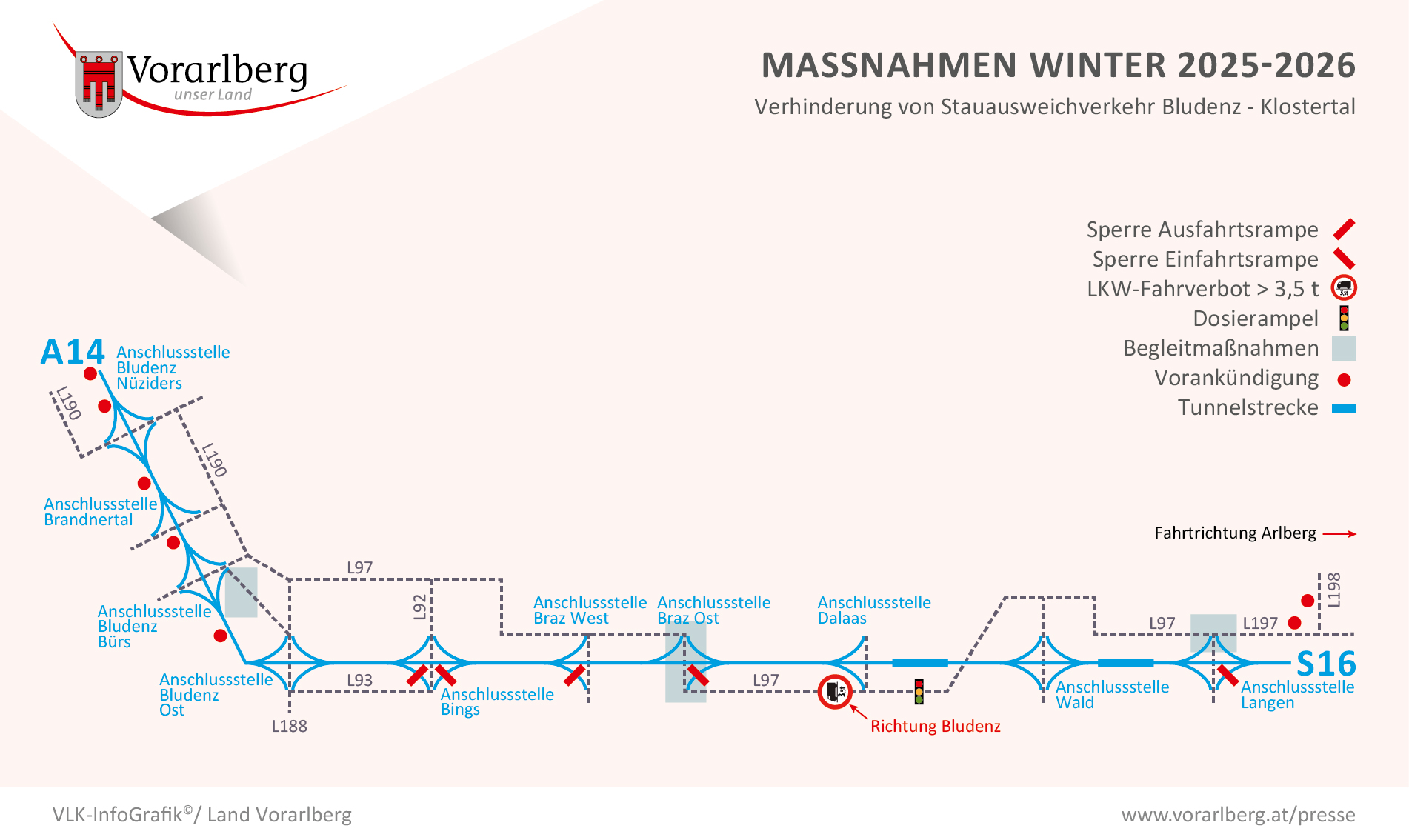 Bludenz (VLK) – Die Hauptrouten zu Schigebieten sind an Winterwochenenden, vor allem an Samstagen, häufig überlastet. Dies gilt auch für die Zufahrt über die A14 (Rheintal-Walgau Autobahn) und S16 (Arlberg-Schnellstraße) in Richtung Klostertal/Arlberg, Montafon und Tirol. Die Stauerscheinungen auf der A14 und S16 führten in der Vergangenheit zu Ausweichverkehr auf dem untergeordneten Straßennetz – zu Lasten der Siedlungsgebiete und Ortszentren im Raum Bludenz und in den Gemeinden im Klostertal. Aufbauend auf den Erkenntnissen der letzten Jahre führt das Land Vorarlberg gemeinsam mit der Regio Klostertal-Arlberg und der Asfinag an insgesamt sechs Samstagen in der Wintersaison 2025/26 wiederum Maßnahmen zur Reduktion dieses Ausweichverkehrs durch.