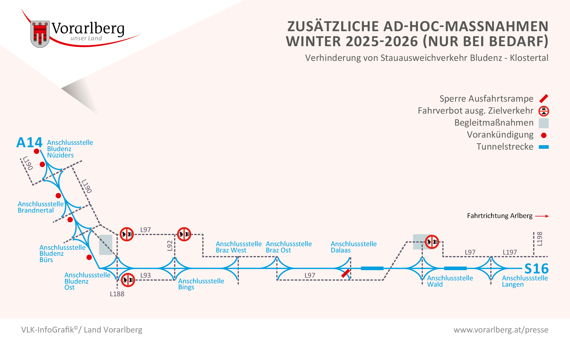 Wenn trotz der Sperren von Auf- und Abfahrtsrampen entlang der S16 und der damit verbundenen höheren Leistungsfähigkeit auf der S16 im Klostertal im Tagesverlauf ein überregionaler Ausweichverkehr absehbar ist, werden zusätzliche Ad-Hoc-Maßnahmen zur Unterbindung dieses überregionalen Ausweichverkehrs auf den Landesstraßen L93 und L97 gesetzt: