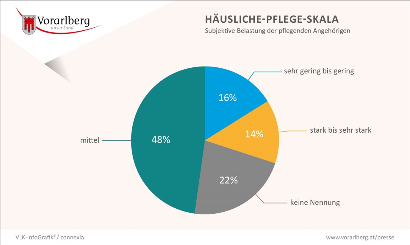 Rund 20.000 Personen in Vorarlberg beziehen Bundespflegegeld. Zwischen 30.000 und 40.000 Menschen beteiligen sich an der Betreuung und Pflege nahestehender Personen. Knapp 40 Prozent der Personen, die eine zu Hause lebende Person betreuen, sind erwerbstätig und über zwei Drittel der pflegenden Angehörigen sind Frauen.