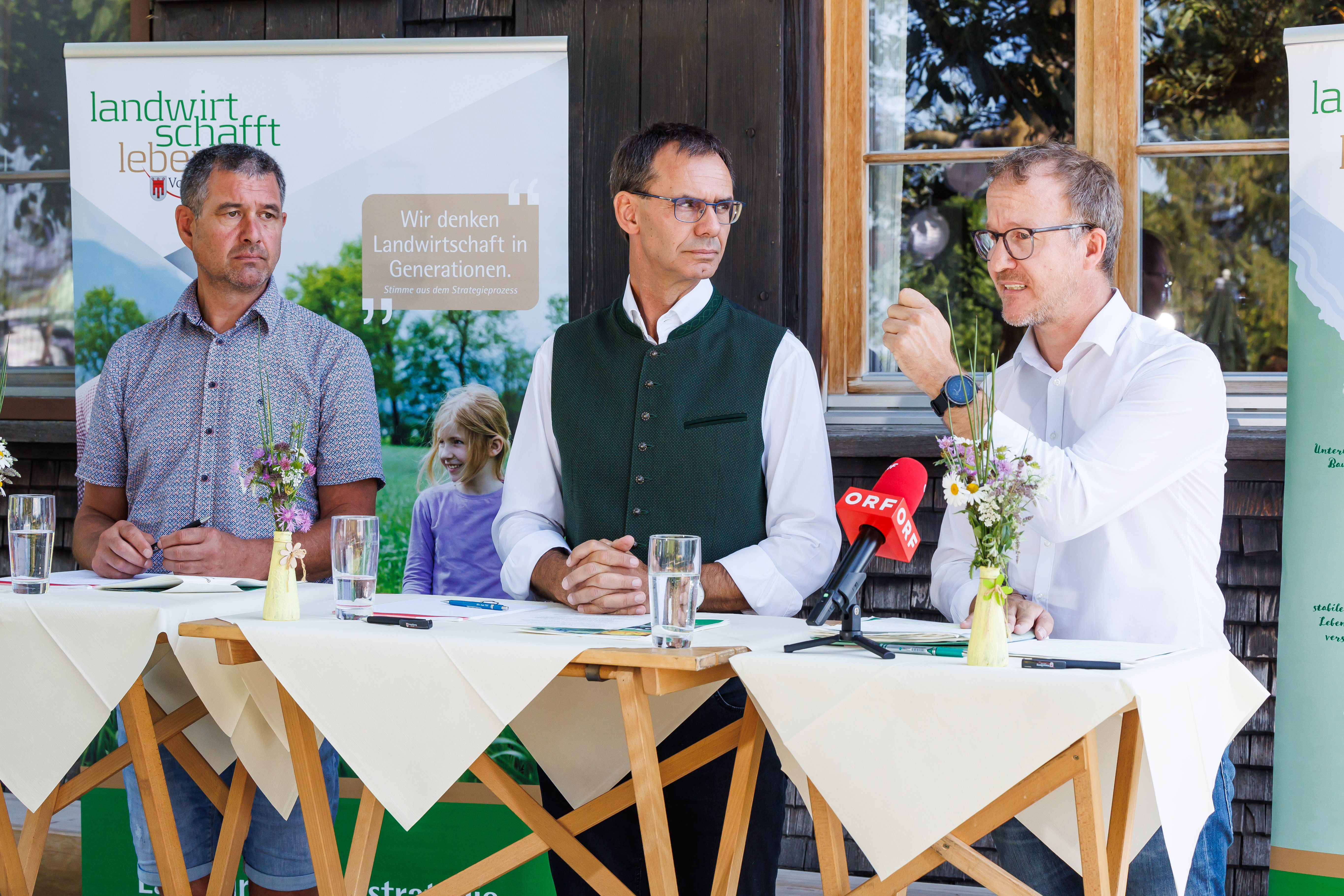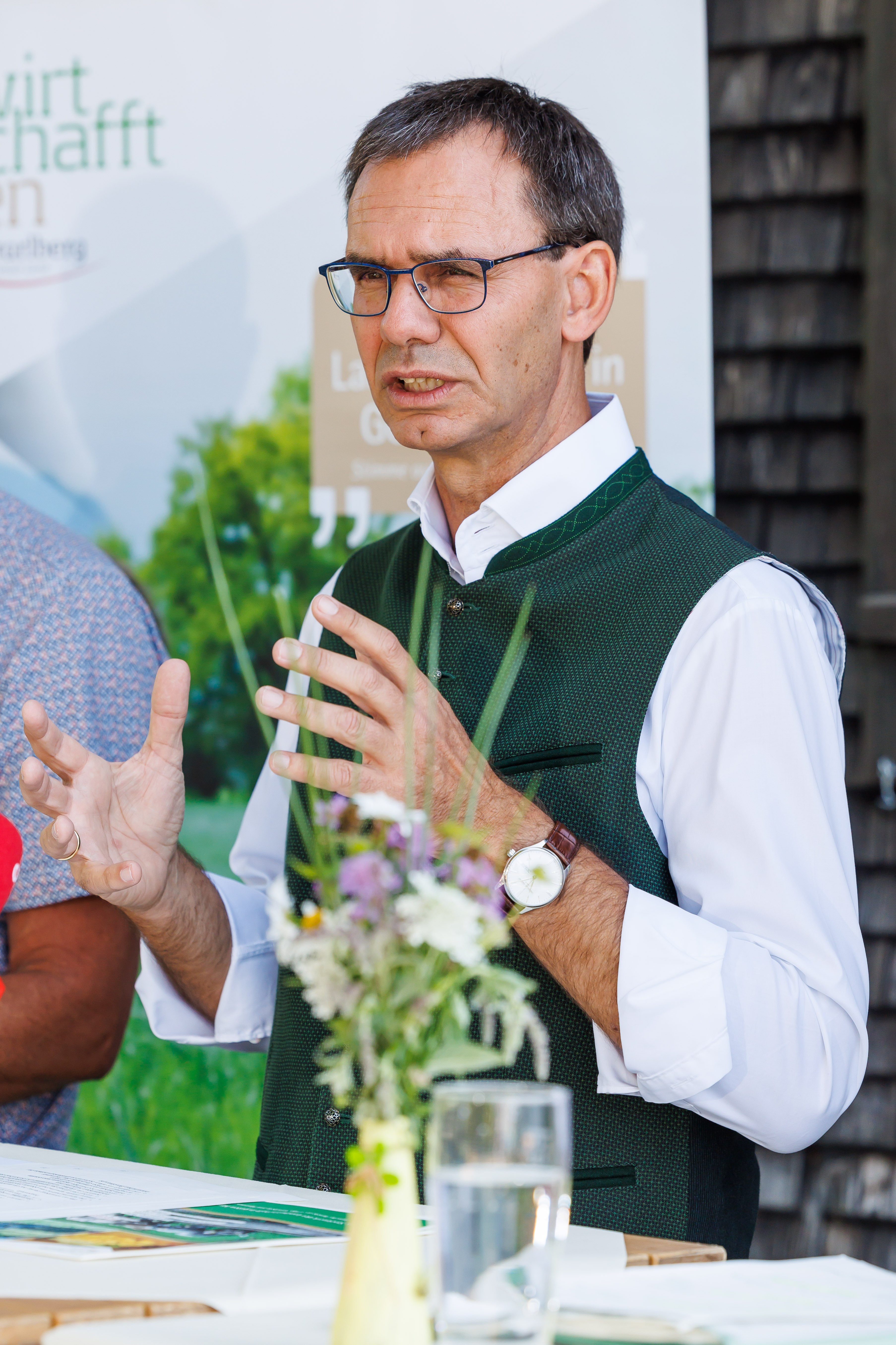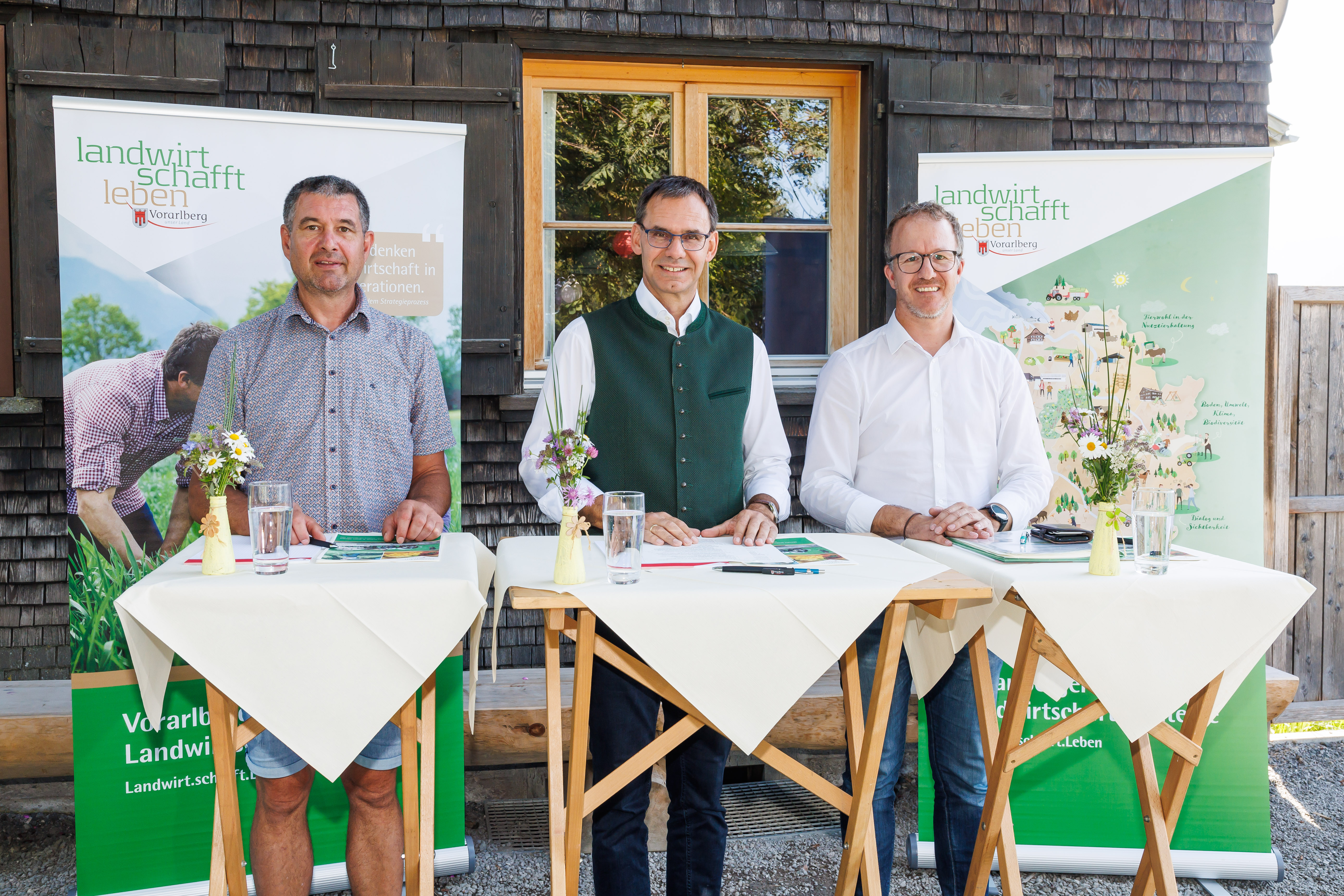 Dornbirn (VLK) – Bereits in den kommenden Wochen finden im ganzen Land die jährlichen Alpabtriebe statt. Zum nahenden Ende der heurigen Alpsaison zogen Landeshauptmann Markus Wallner, Landwirtschaftslandesrat Christian Gantner, der zuständige Abteilungsvorstand Wolfgang Burtscher und Funktionsbereichsleiter Martin Rusch eine überwiegend positive Bilanz. Die unverzichtbare Arbeit der Alpwirtschaft besteht neben der Futterproduktion für die landwirtschaftlichen Betriebe, in der Erzeugung von Lebensmitteln sowie in der Landschaftspflege für die Freizeitnutzung und den Tourismus. „Wer an Vorarlberg denkt, hat unsere wunderschönen Alpen vor Augen. Dieses Bild gilt es weiterhin zu erhalten“, waren sich Wallner und Gantner einig.