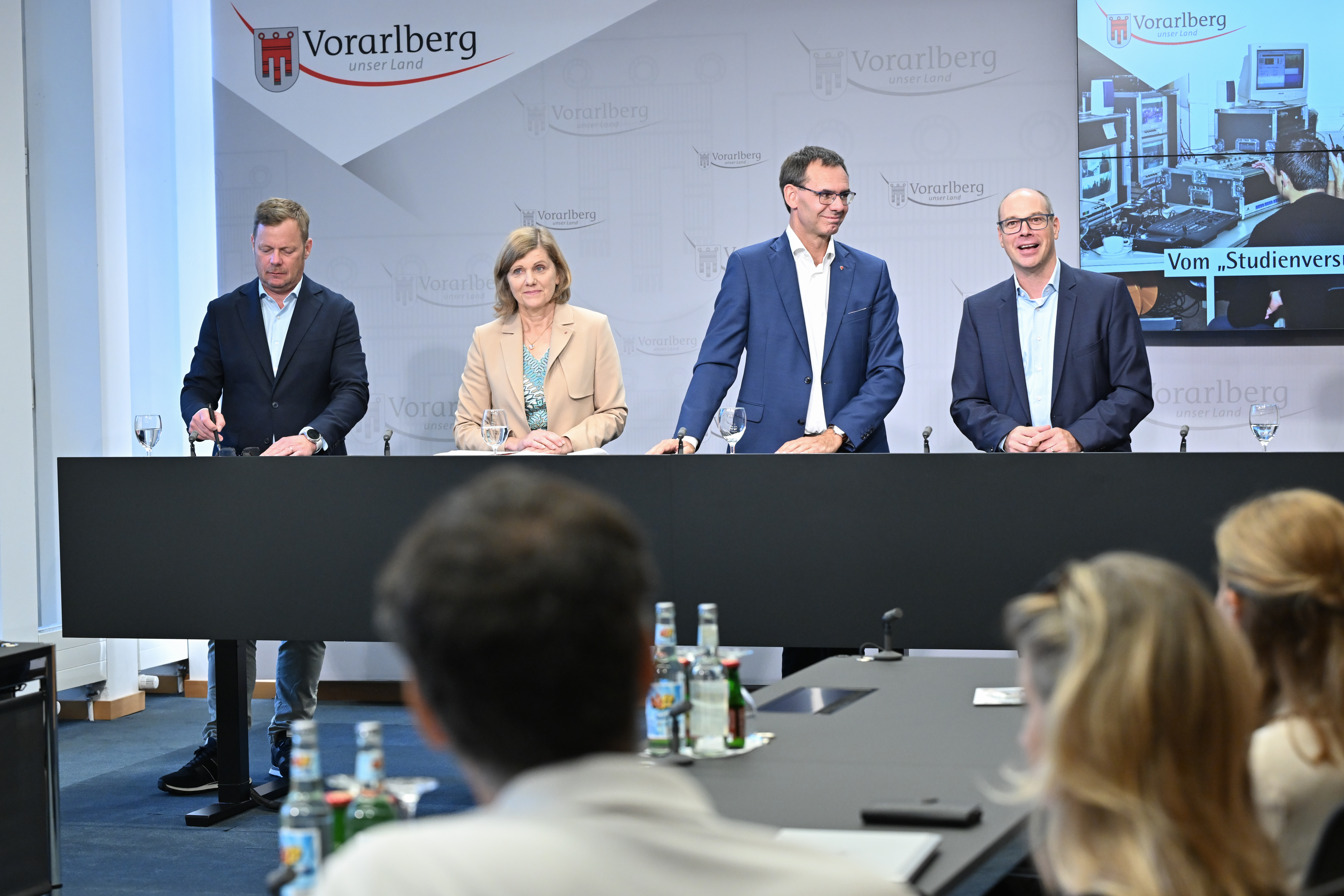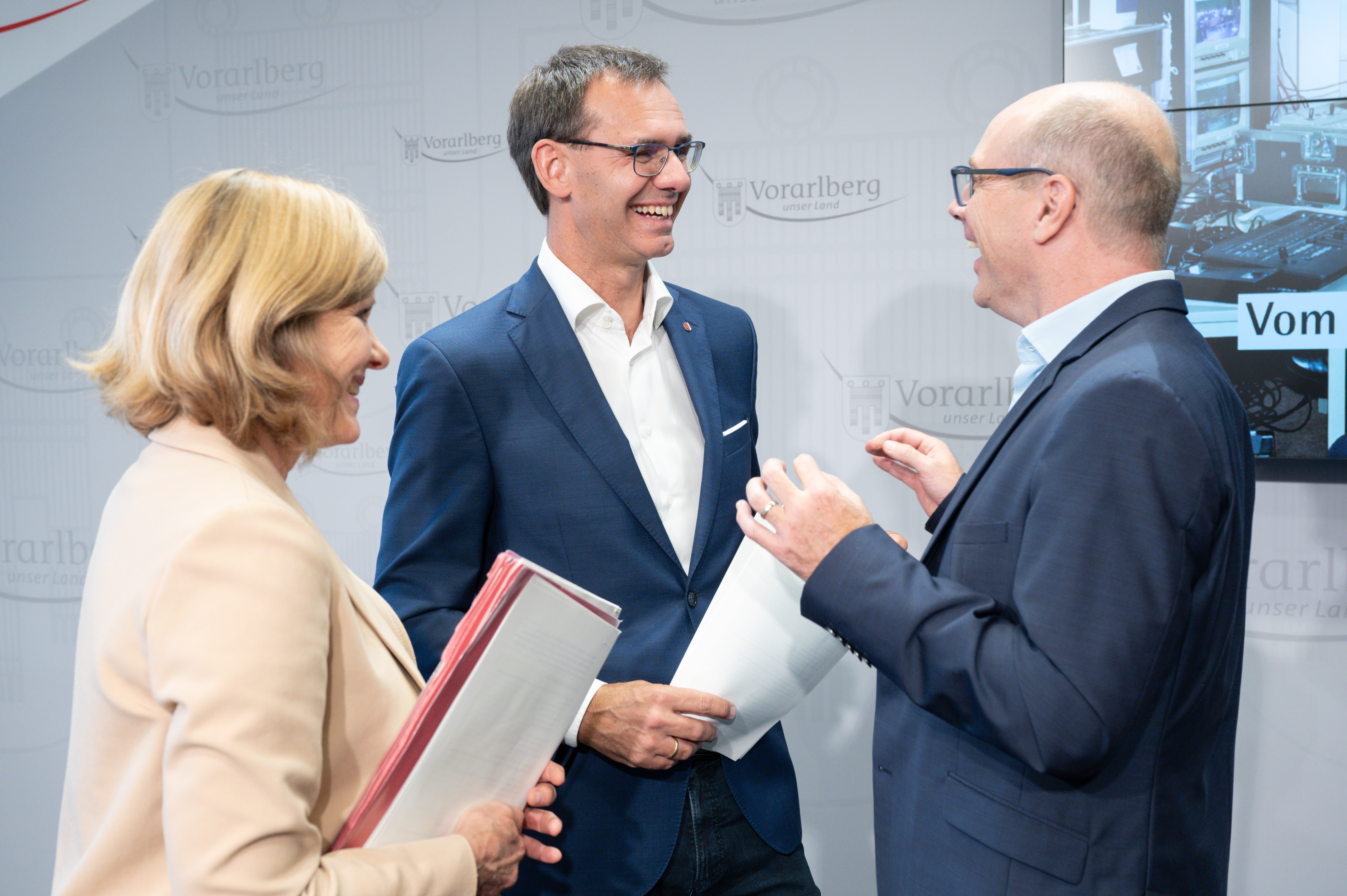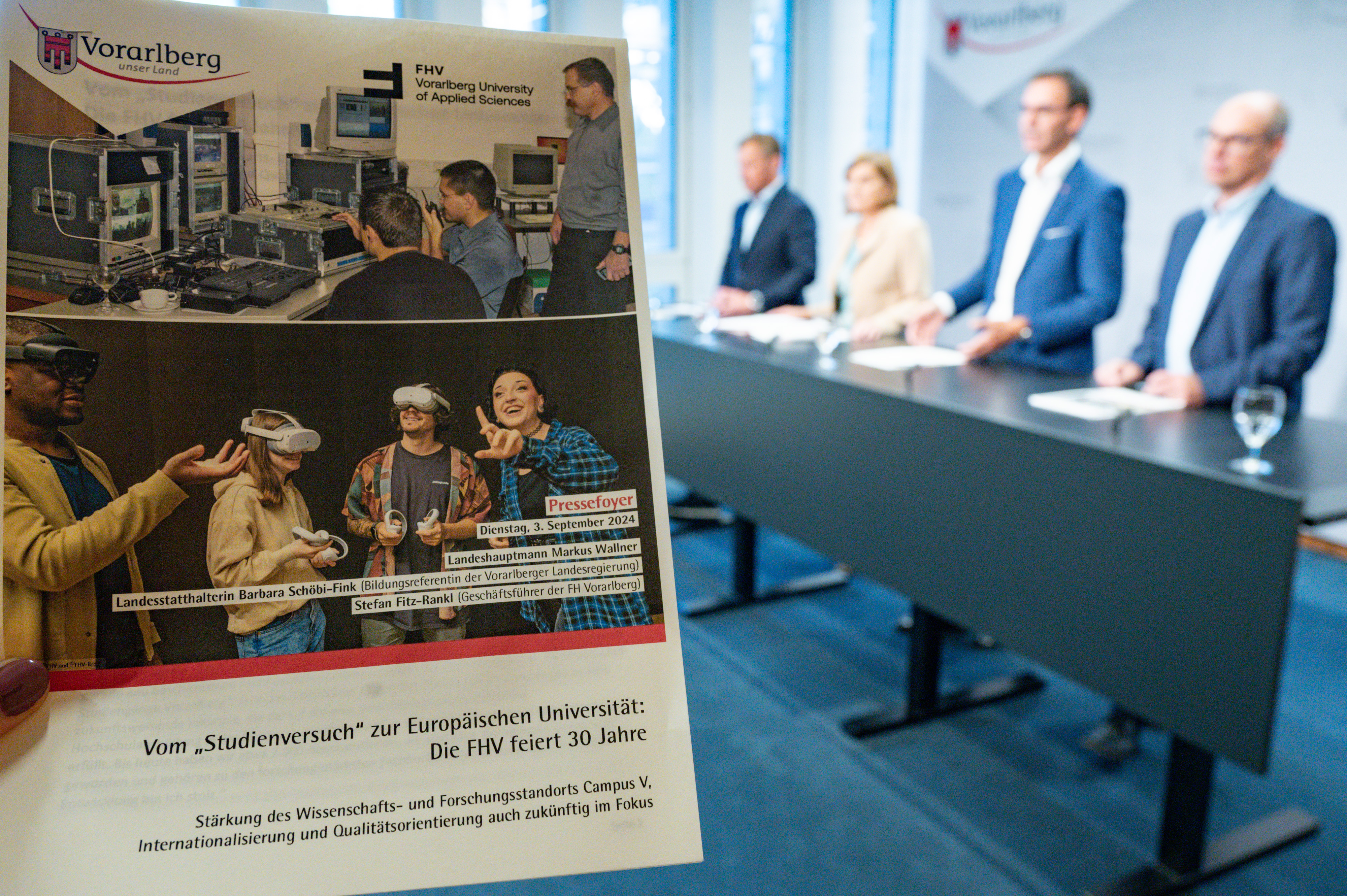 Bregenz (VLK) – Zum 30-Jahre-Jubiläum der Fachhochschule Vorarlberg (FHV) sprachen Landeshauptmann Markus Wallner und Landesstatthalterin Barbara Schöbi-Fink gemeinsam mit FHV-Geschäftsführer Stefan Fitz-Rankl im heutigen (Dienstag, 3. September) Pressefoyer von einer beeindruckenden Erfolgsgeschichte und richteten den Blick in die Zukunft. „Die FHV ist in wenigen Jahrzehnten aus einem ‚Studienversuch‘ zu einer Europäischen Universität gewachsen – zu einem Leuchtturm des Bildungs- und Wirtschaftsstandorts Vorarlberg. Ihre zentralen Aufgaben als erstklassige Fachkräfteschmiede und führende Forschungspartnerin der heimischen Wirtschaft sowie die internationale Vernetzung stehen auch im Fokus der künftigen Ausrichtung“, sagte Wallner.