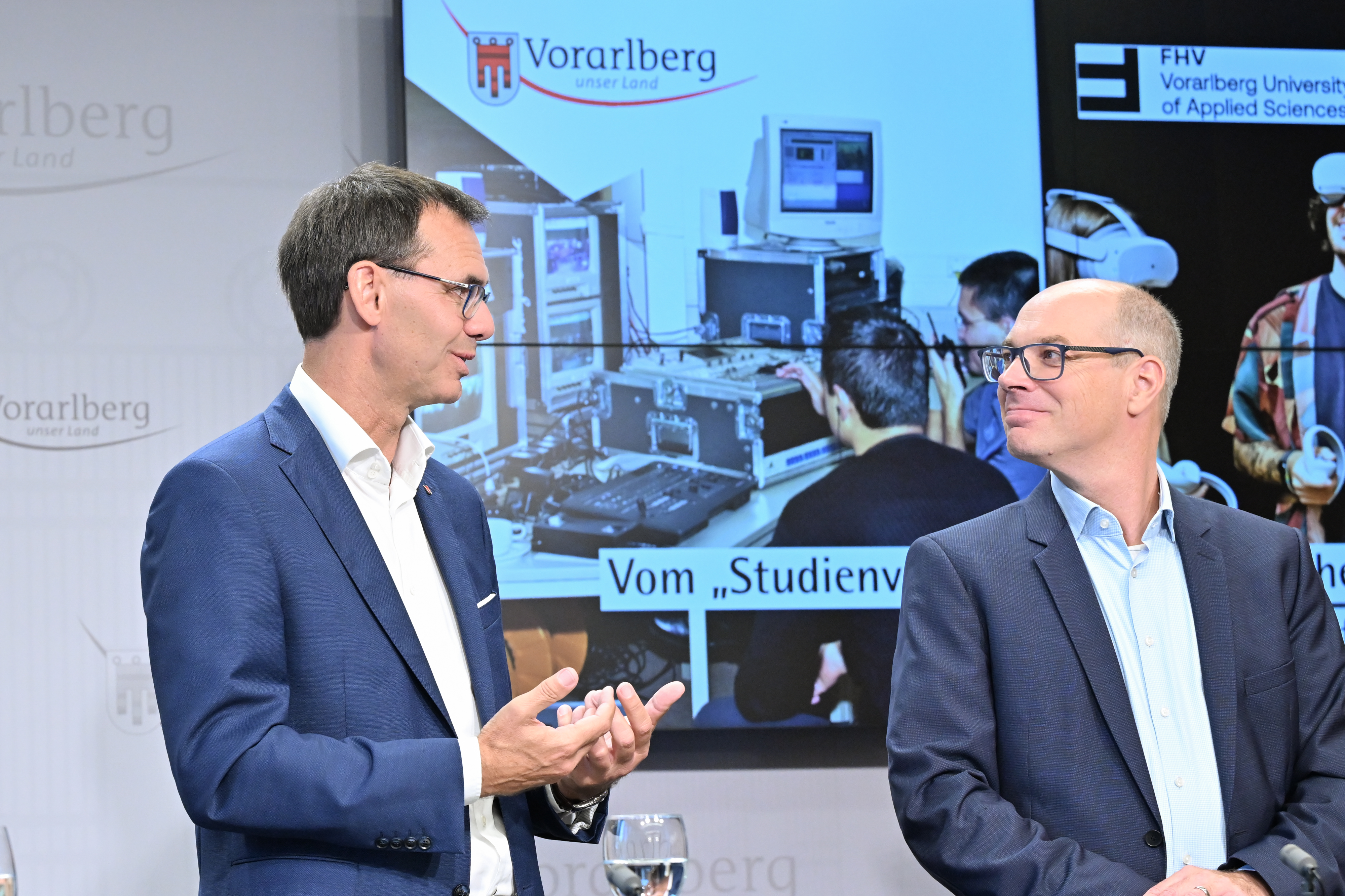 Der Start erfolgte seinerzeit mit zehn Mitarbeitenden und 45 Studierenden, heute zählt die FHV 400 Beschäftigte und über 1.500 Studierende in 25 Studienprogrammen. In den kommenden Jahren gelte es die dynamische Entwicklung weiter voranzutreiben, um Vorarlberger Unternehmen mit top-ausgebildeten Fachkräften und innovativer Forschung zu unterstützen, betonte Wallner: „Mit dem laufenden Großprojekt zum Ausbau und zur Sanierung der Infrastruktur, in das wir in Summe rund 50 Millionen Euro investieren, werden am Campus V die Weichen für die Zukunft gestellt. Zudem setzen wir auf die Weiterentwicklung der Kooperationen mit der Hochschule St.Gallen und im Rahmen des RUN-EU-Netzwerks.“