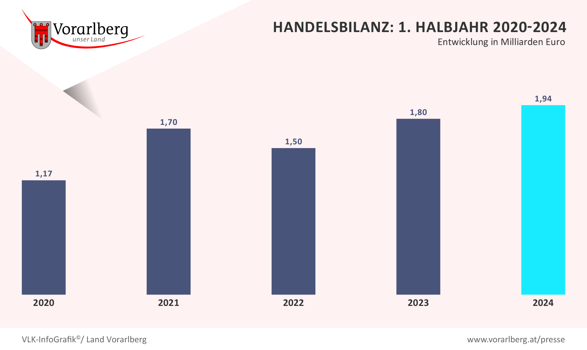 Medieninformation Donnerstag, 02.01.2025, 09:00 Rekord-Handelsüberschuss – trotz Rückgang zeigt Vorarlberger Außenhandel Stabilität LH Wallner, LR Tittler und WK-Präsident Kopf informieren über Außenhandelsbericht für erstes Halbjahr 2024: „Widerstandsfähigkeit der Wirtschaft bleibt erhalten“