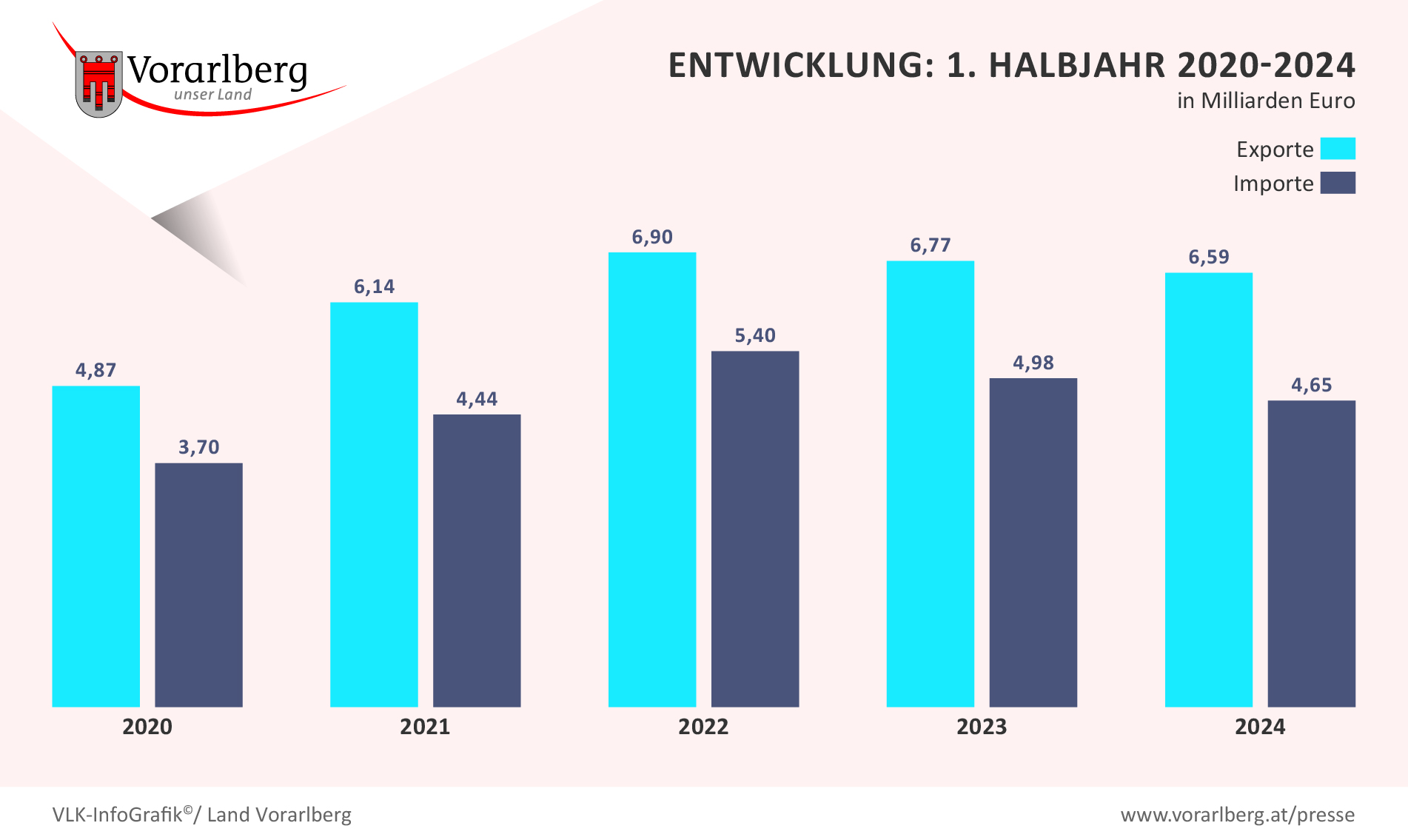 Bregenz (VLK) – Der aktuelle Außenhandelsbericht der Landesstelle für Statistik für das erste Halbjahr 2024 zeigt trotz rückläufiger Export- und Importzahlen die anhaltende Stabilität der Vorarlberger Wirtschaft. In den ersten sechs Monaten des Jahres wurden nach vorläufigen Ergebnissen Waren im Gesamtwert von 6,6 Milliarden Euro exportiert - der Wert der Importe betrug rund 4,6 Milliarden Euro. „Daraus ergibt sich ein Handelsbilanzüberschuss von 1,9 Milliarden Euro, der höchste jemals gemessene Halbjahresüberschuss“, so Landeshauptmann Markus Wallner. Gemeinsam mit Wirtschaftslandesrat Marco Tittler und dem neuen Präsidenten der Wirtschaftskammer Vorarlberg, Karlheinz Kopf, unterstrich er die Widerstandsfähigkeit der heimischen Unternehmen.
