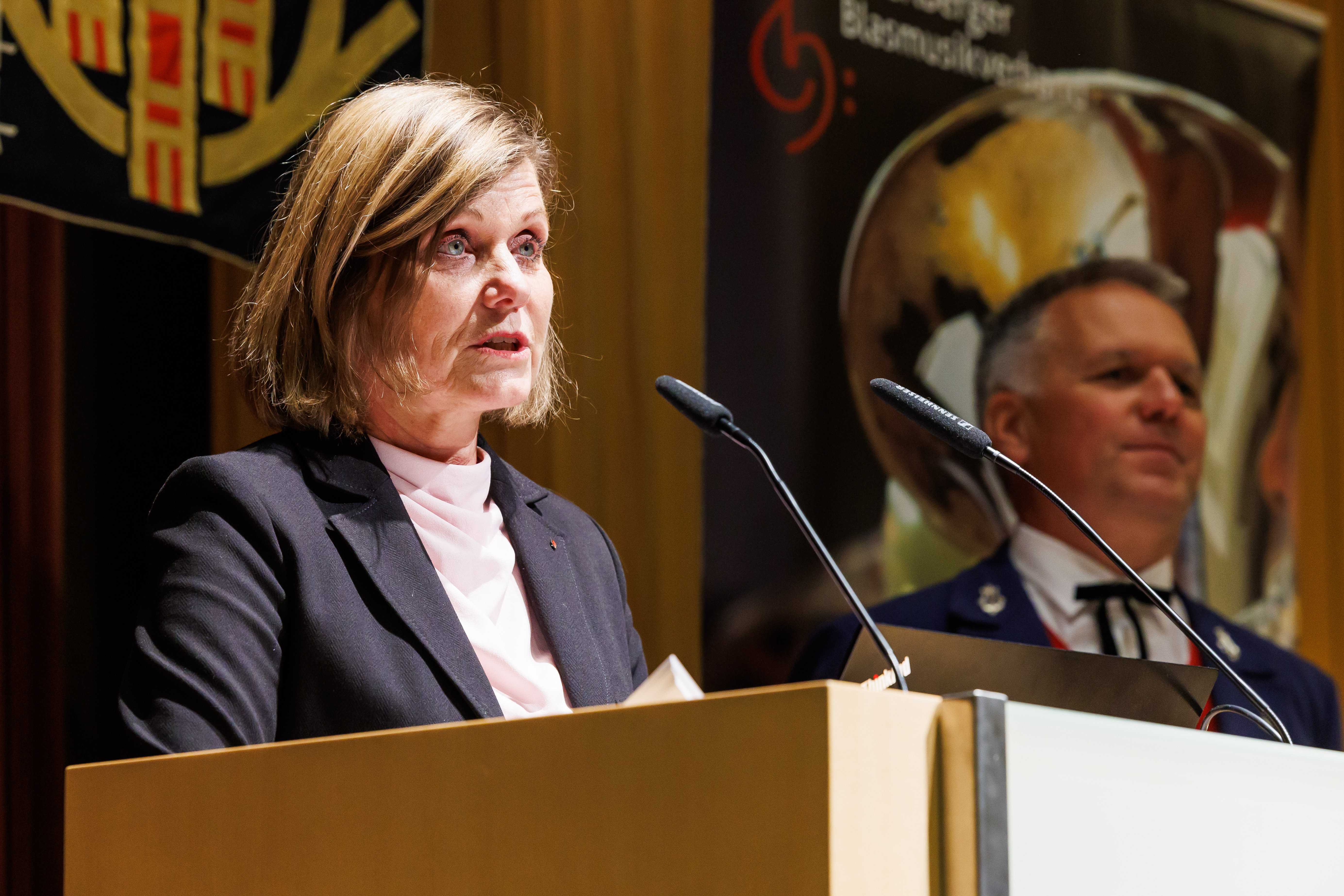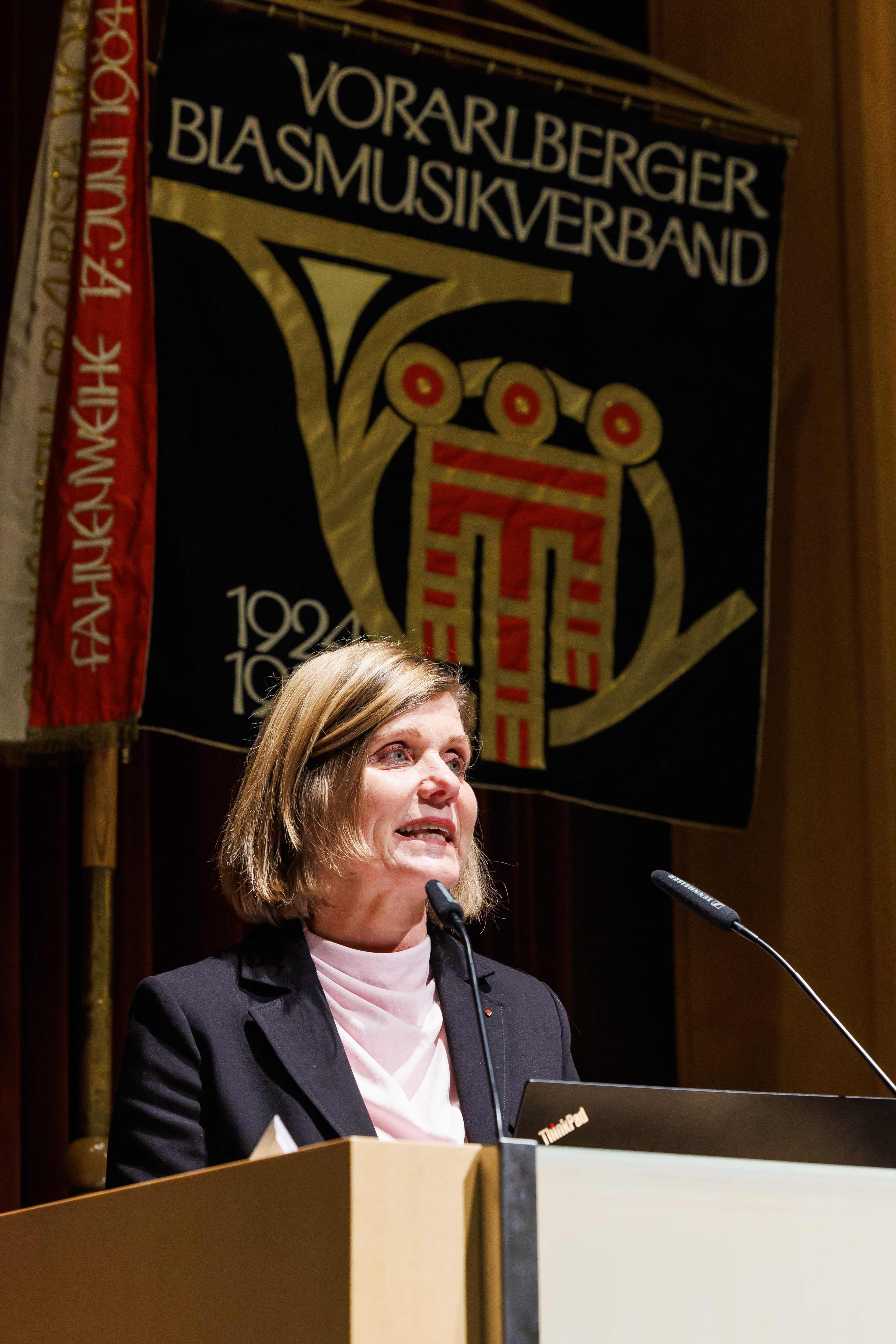 Frastanz (VLK) – Zum beeindruckenden 100. Mal fand heute (11. November) die Generalversammlung des Vorarlberger Blasmusikverbandes (VBV) im Ramschwagsaal in Nenzing statt. Kulturlandesrätin Barbara Schöbi-Fink nahm an der Jubiläumsveranstaltung teil, in deren Rahmen der langjährige Obmann Wolfram Baldauf verabschiedet wurde und symbolisch das Landesbanner an seinen Nachfolger Thomas Rudigier übergab. Schöbi-Fink dankte Baldauf für sein herausragendes Engagement, das die Blasmusik in Vorarlberg geprägt und bereichert habe: „Sein unermüdlicher Einsatz und seine Leidenschaft sind vorbildlich.“
