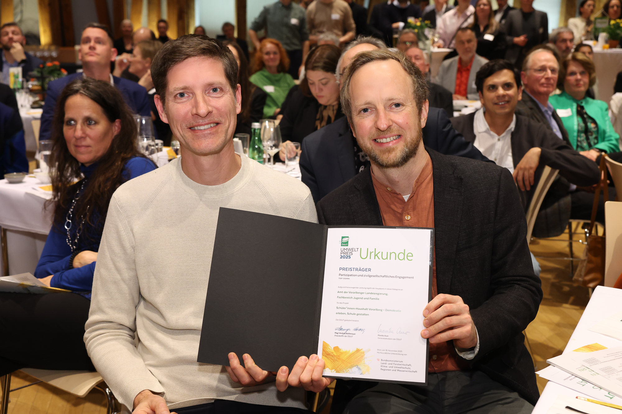 Bregenz (VLK) – Ein großer Erfolg für die Beteiligungsarbeit in Vorarlberg: Der Schülerinnen- und Schülerhaushalt wurde am Dienstagabend (18. November) an der Technischen Universität Wien mit dem ÖGUT-Umweltpreis 2025 ausgezeichnet und belegte in der Kategorie „Partizipation und zivilgesellschaftliches Engagement – Top Down“ den 1. Platz. Die Jury würdigte das Format als beispielgebende Initiative, die Schülerinnen und Schüler frühzeitig in Entscheidungsprozesse einbindet und ihnen echte Verantwortung überträgt.