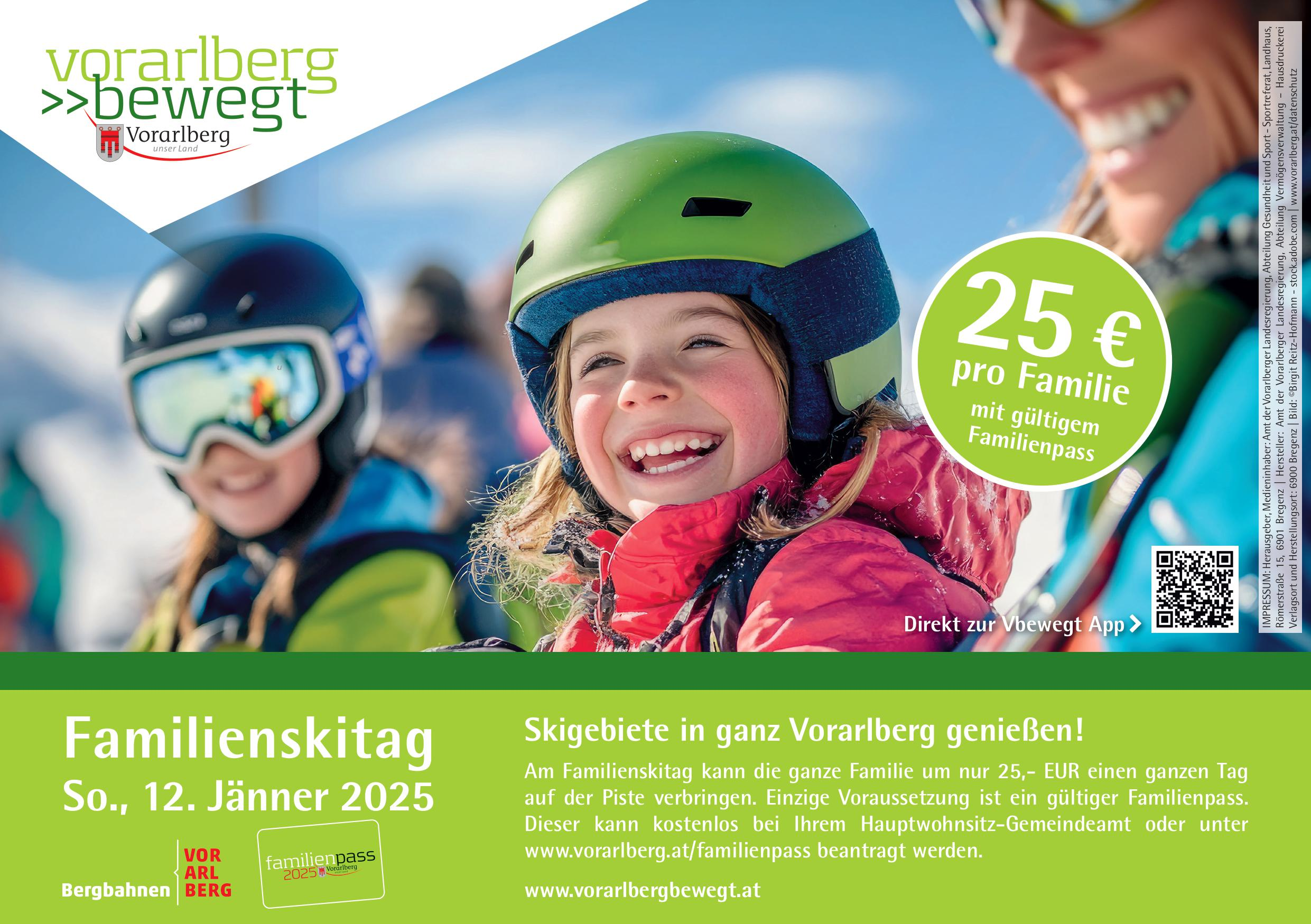 Bregenz (VLK) – Das Land Vorarlberg und die Fachgruppe Seilbahnen der Wirtschaftskammer laden auch diesen Winter zum vergünstigten Pistenspaß mit dem Familienpass. Der vorarlberg >>bewegt Familienskitag findet am Sonntag, 12. Jänner 2025, wieder in allen Skigebieten im Lande statt. Gegen Vorlage des Vorarlberger Familienpasses – Karte oder digital auf dem Smartphone – gibt es das Tagesticket für die ganze Familie um 25 Euro.