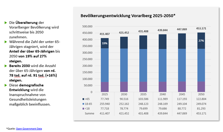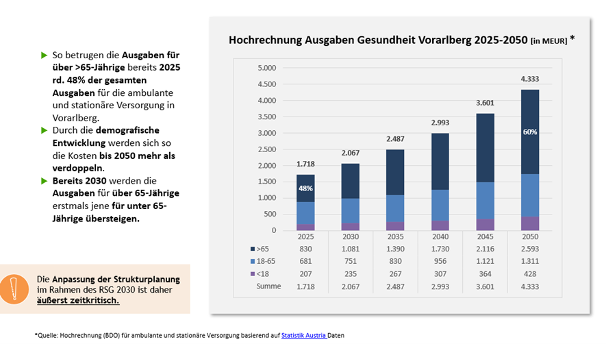 „Die Ausgaben für über 65-Jährige werden bereits im Jahr 2025 rund 48 Prozent der gesamten Ausgaben für die ambulante und stationäre Versorgung in Vorarlberg ausmachen. Aufgrund der demografischen Entwicklung werden sich diese Kosten bis 2050 voraussichtlich mehr als verdoppeln“, verdeutlicht Johannes Hohenauer, Geschäftsführer der BDO Health Care Consultancy, als externer fachlicher Prozessbegleiter. Bereits 2030 werden die Ausgaben für über 65-Jährige erstmals jene für unter 65-Jährige übersteigen. Hohenauer: „Die Anpassung der Strukturplanung im Rahmen des RSG 2030 ist daher von hoher Dringlichkeit. Durch den Ausbau ambulanter Angebote werden stationäre Kapazitäten gezielt entlastet und Gesundheitsausgaben langfristig optimiert.“
