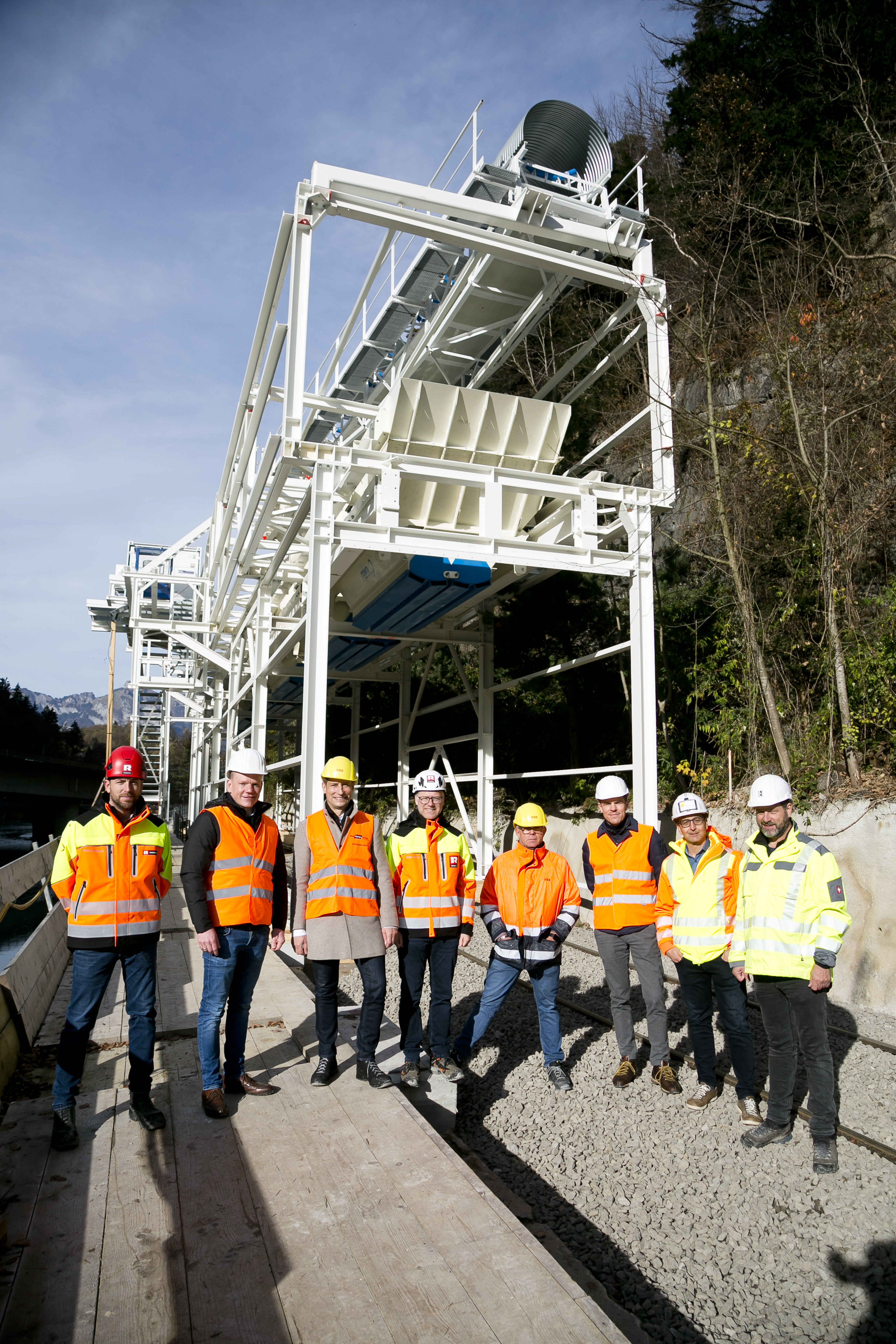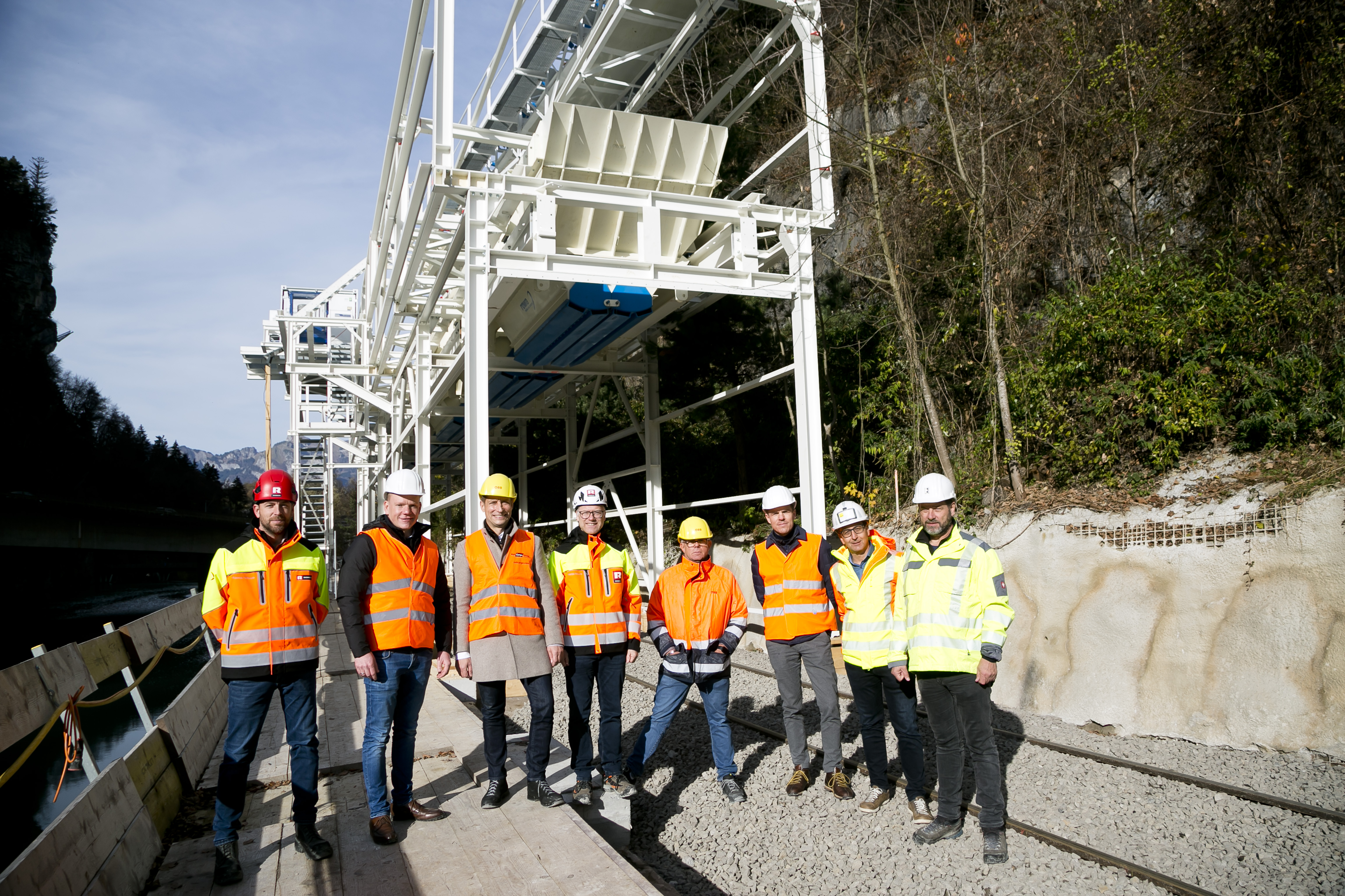 Von links nach rechts: Thomas Witsch (Geschäftsfeldleiter Rhomberg Steinbruch) LSth. Christof Bitschi Christoph Grasl (Rail Cargo Austria-Vorstand) Stefan Rusch (GF Rhomberg Bau, Bereich Bau und Ressourcen) Michael Fellier (Rail Cargo Austria) Martin Zitt (Vorstand Abteilung Straßenbau Land Vorarlberg) Josef Tschofen (Bereichsleitung Untertagebau bei Jäger Bau) Bernhard Braza (Projektleiter Stadttunnel Feldkirch)