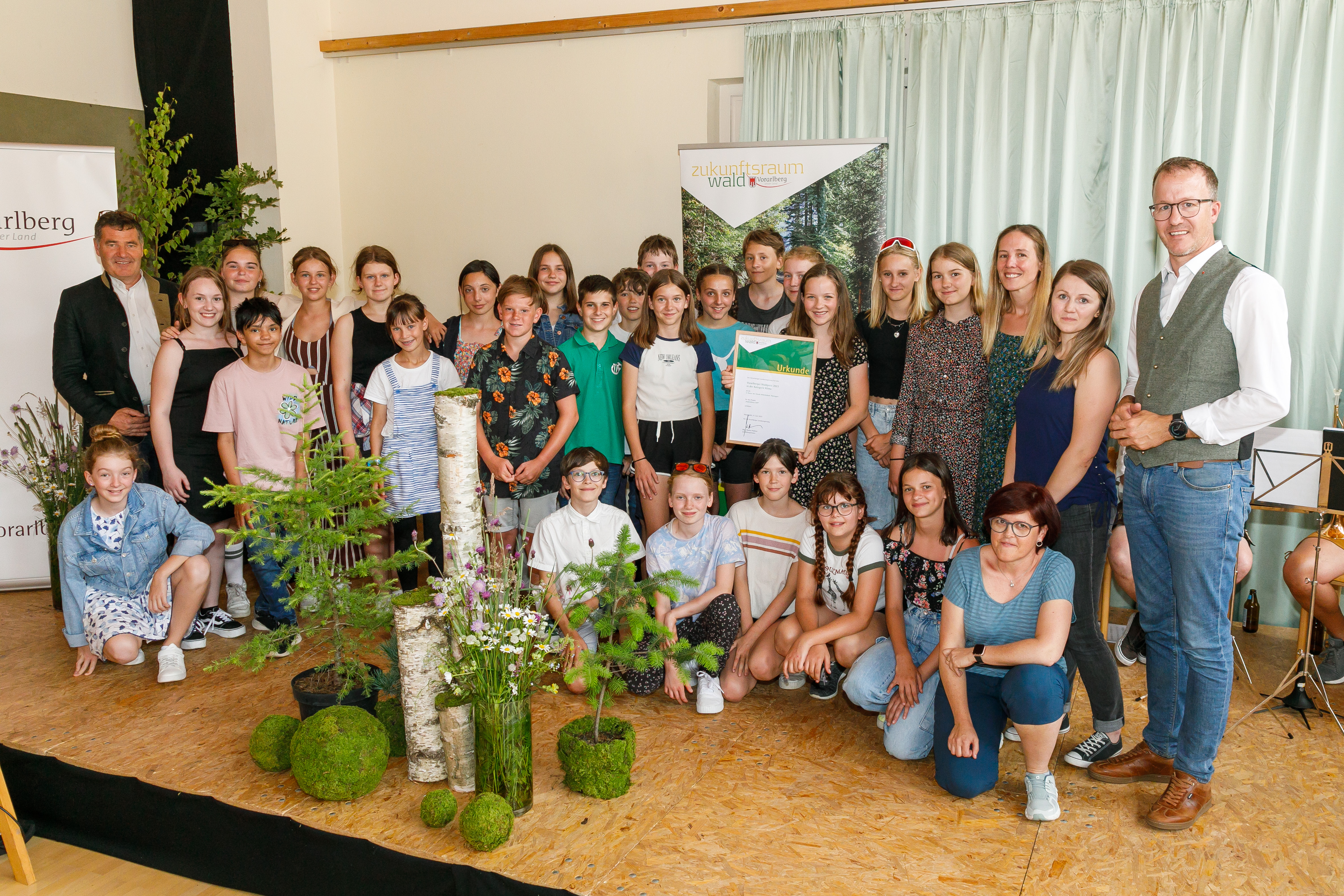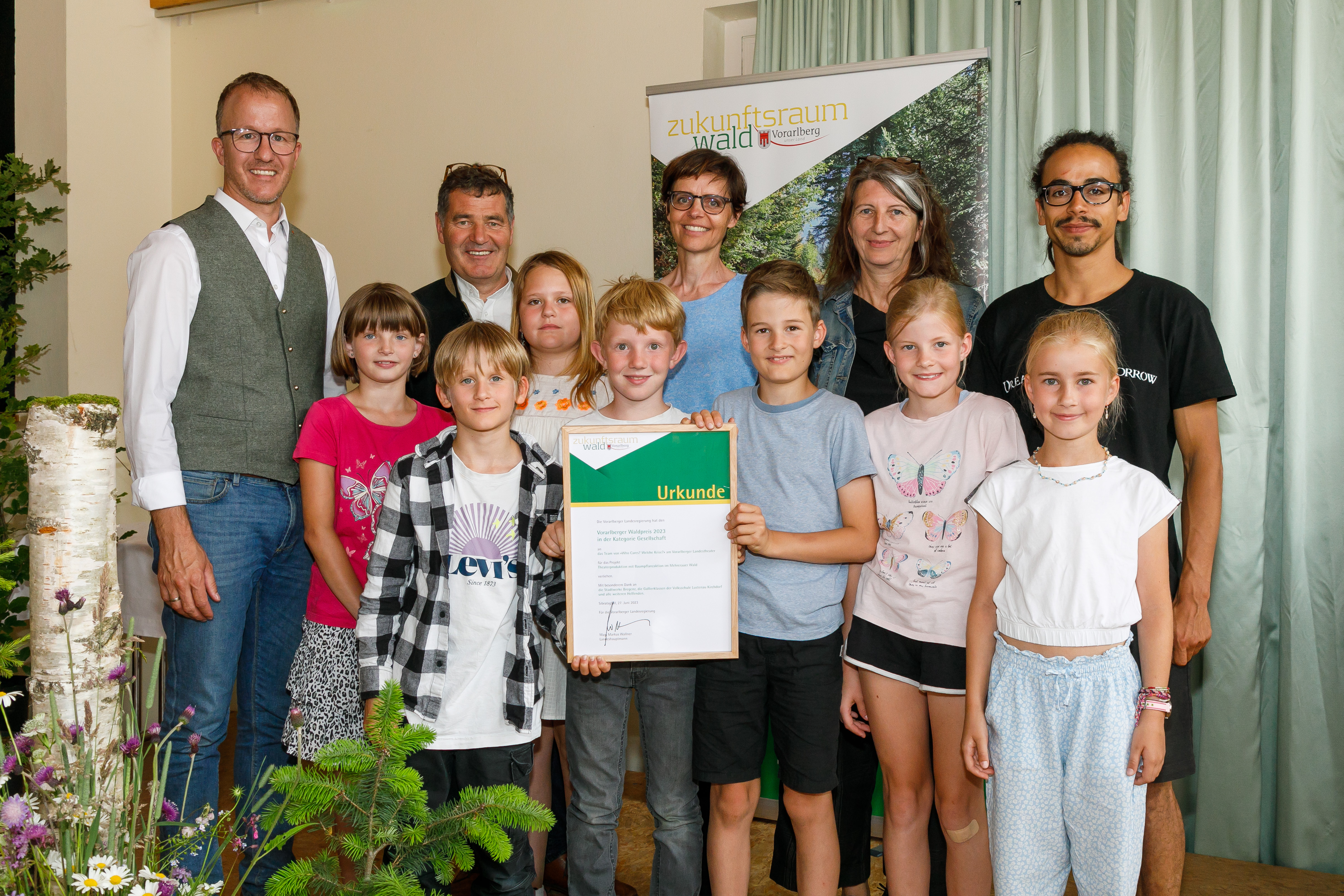 Sibratsgfäll (VLK) – Ohne intakte Schutzwälder wären in Vorarlberg große Teile des Landes gar nicht bewohnbar. Insbesondere infolge des sich verändernden Klimas müssen aber auch die anderen natürlichen Waldfunktionen sorgfältig beachtet und verstärkt in den Blickpunkt der Öffentlichkeit gerückt werden. Daher ist der Vorarlberger Schutzwaldpreis ab heuer zum Vorarlberger Waldpreis erweitert worden. Landesrat Christian Gantner überreichte am Dienstag, 27. Juni, im Schulsaal Sibratsgfäll die Preise in fünf Kategorien und gratulierte den Preisträgern.