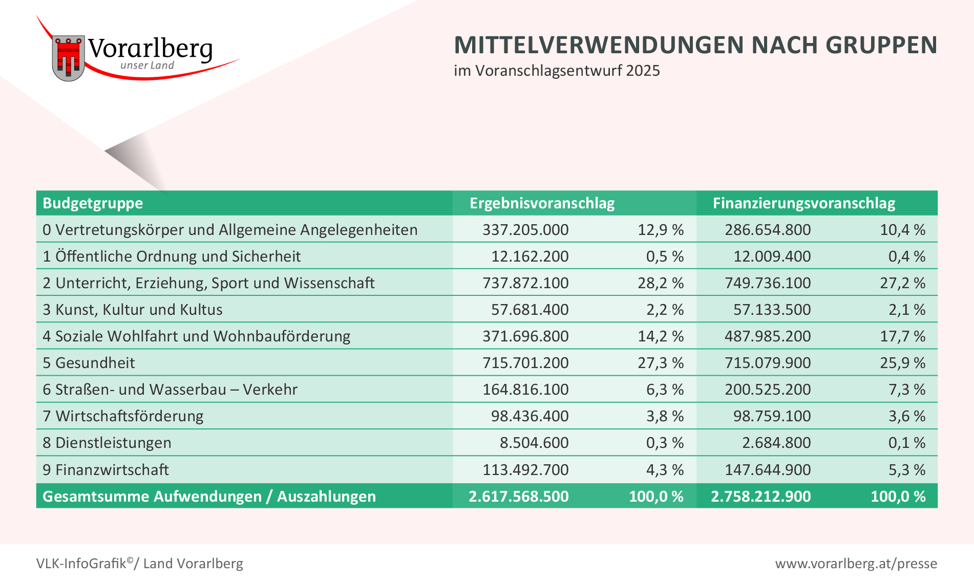 Der von der Vorarlberger Landesregierung einstimmig beschlossene und dem Landtag zur Beschlussfassung übermittelte Budgetentwurf 2025 sieht einen Ergebnisvoranschlag mit Aufwendungen in der Höhe von 2.617.568.500 Euro (nach Rücklagen) und einem Nettoergebnis nach Haushaltsrücklagen von -174.414.200 Euro vor. Der Finanzierungsvoranschlag mit Auszahlungen in der Höhe von 2.758.212.900 Euro weist eine Veränderung an Zahlungsmitteln von -21.869.000 Euro aus. Schwerpunkte sind erneut die Bereiche Bildung, Soziales und Gesundheit sowie Wohnbauförderung. Auf diese Gruppen entfallen zusammen rund 70 Prozent der Mittel.
