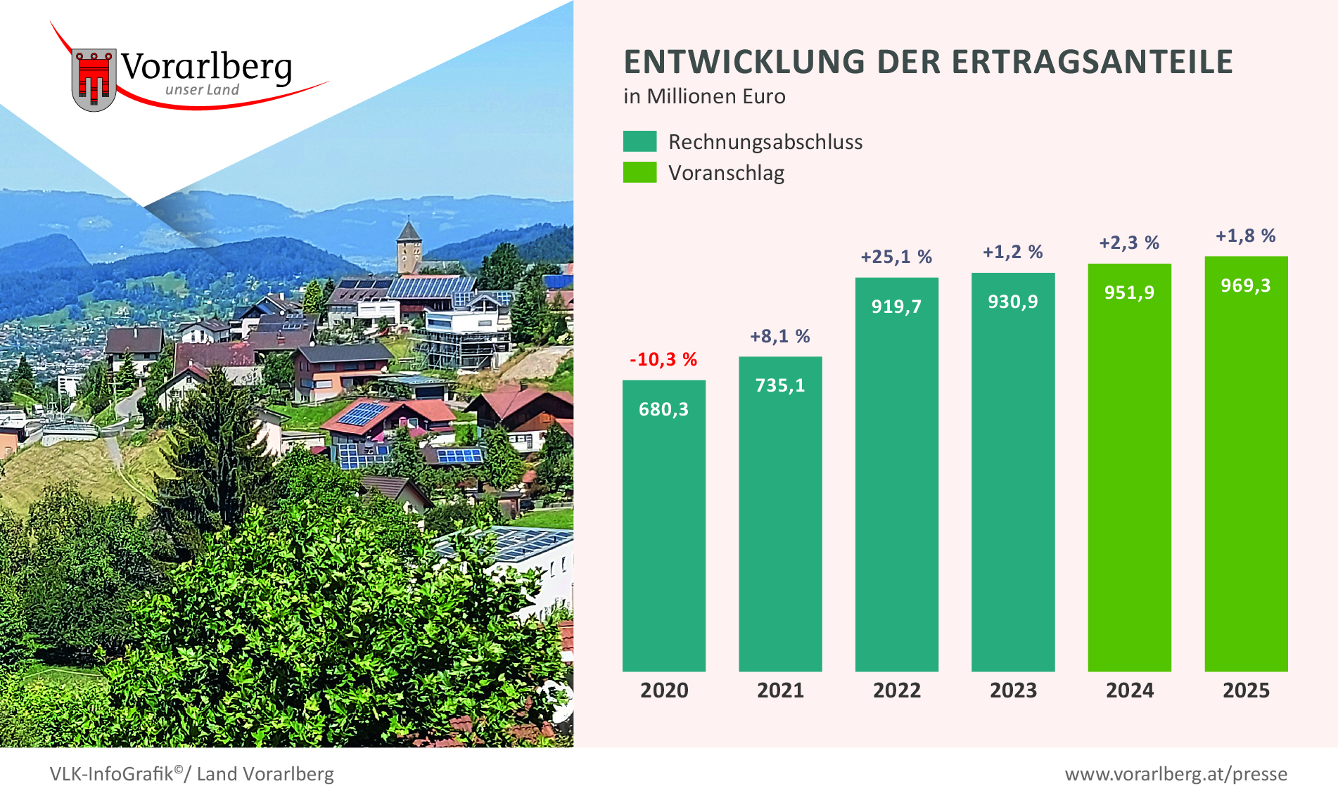 Die Ertragsanteile werden im kommenden Jahr voraussichtlich nur leicht steigen. Der Landesvoranschlag 2025 sieht Ertragsanteile in Höhe von rund 970 Millionen Euro vor, um 1,8 Prozent mehr als für das laufende Jahr budgetiert waren. Ausschlaggebend für die geringe Steigerung sind einerseits die schwachen Konjunkturaussichten, andererseits die für die Bevölkerung und die Wirtschaft sinnvollen steuerlichen Entlastungsmaßnahmen, die sich andererseits jedoch einnahmenseitig in den öffentlichen Budgets niederschlagen.