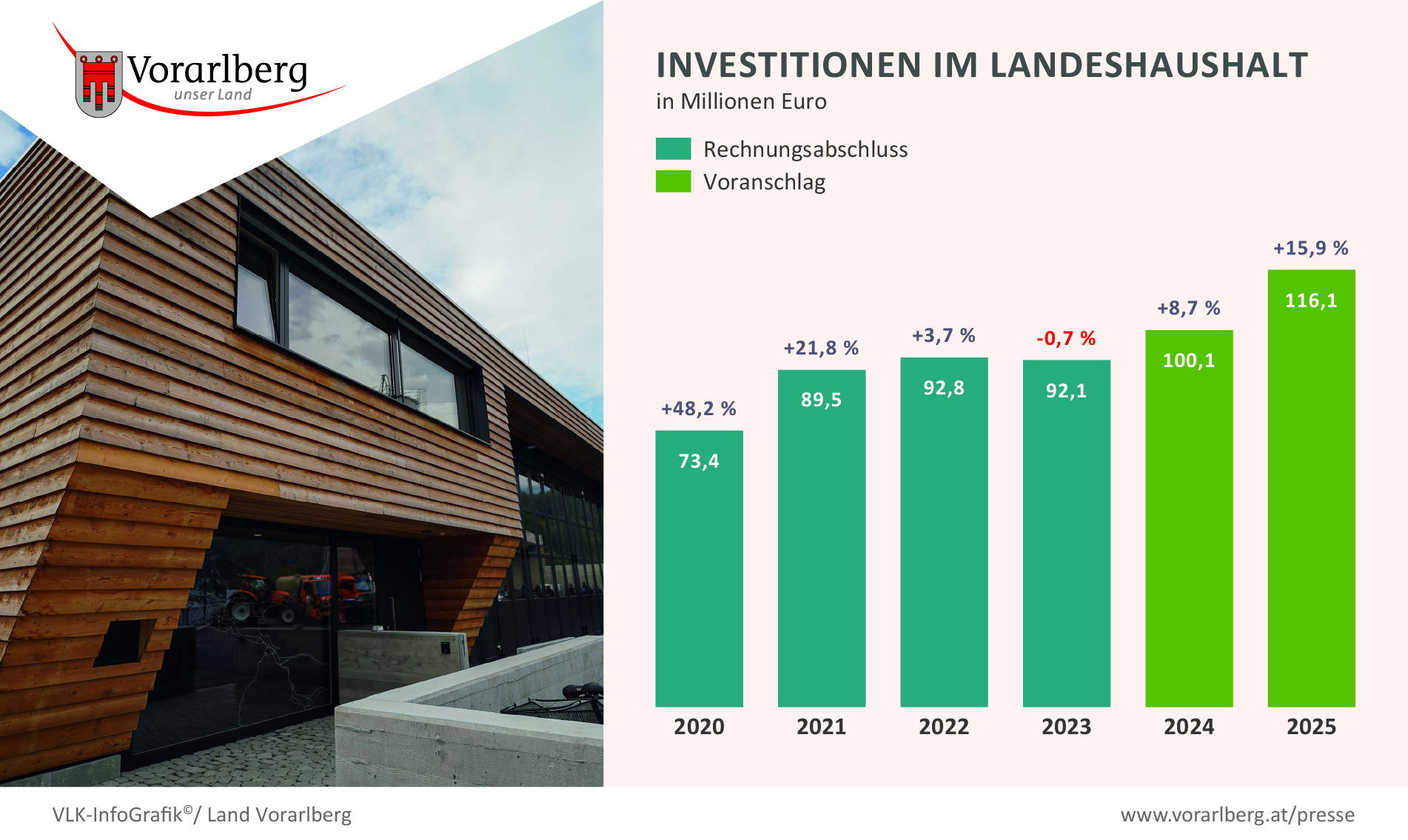 Im Landesvoranschlag 2025 sind Investitionen in das Landesvermögen in Höhe von 116,1 Millionen Euro vorgesehen, das sind um fast 16 Prozent mehr als im laufenden Budget. Damit unterstreicht das Land Vorarlberg einmal mehr seine Entschlossenheit, wichtige Impulsprogramme und Infrastrukturprojekte zu finanzieren.