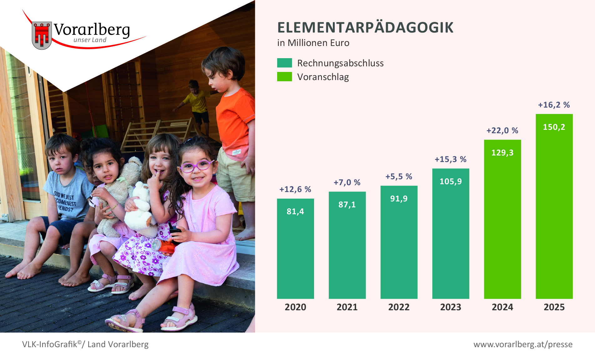 Das Land Vorarlberg legt weiterhin einen Fokus auf die Elementarpädagogik und erhöht dafür das Budget kontinuierlich. Diese Investitionen spiegeln die hohe Bedeutung der frühkindlichen Bildung und Betreuung wider, da sie entscheidend für die Entwicklung von Kindern ist und eine solide Basis für deren Lebens- und Bildungsweg legt. Die zusätzlichen Mittel fließen vor allem in den Ausbau der Bildungs- und Betreuungsplätze, die Qualifizierung und Fortbildung des pädagogischen Personals sowie in die Schaffung moderner Lern- und Spielräume. Damit reagiert das Land Vorarlberg auf den steigenden Bedarf an qualitativ hochwertigen Bildungs- und Betreuungsangeboten und setzt ein klares Zeichen für die Förderung der jüngsten Generationen. Bereits für das letzte Jahr waren 129,3 Millionen Euro veranschlagt, der Budgetentwurf 2025 sieht mit 150,2 Millionen Euro (inkl. Zukunftsfondsmittel) einen weiteren massiven Investitionsschub vor.