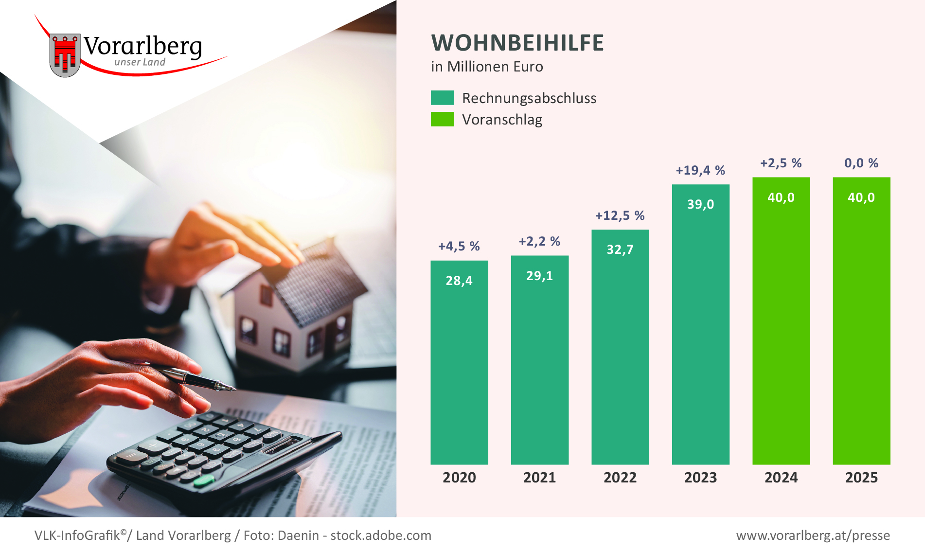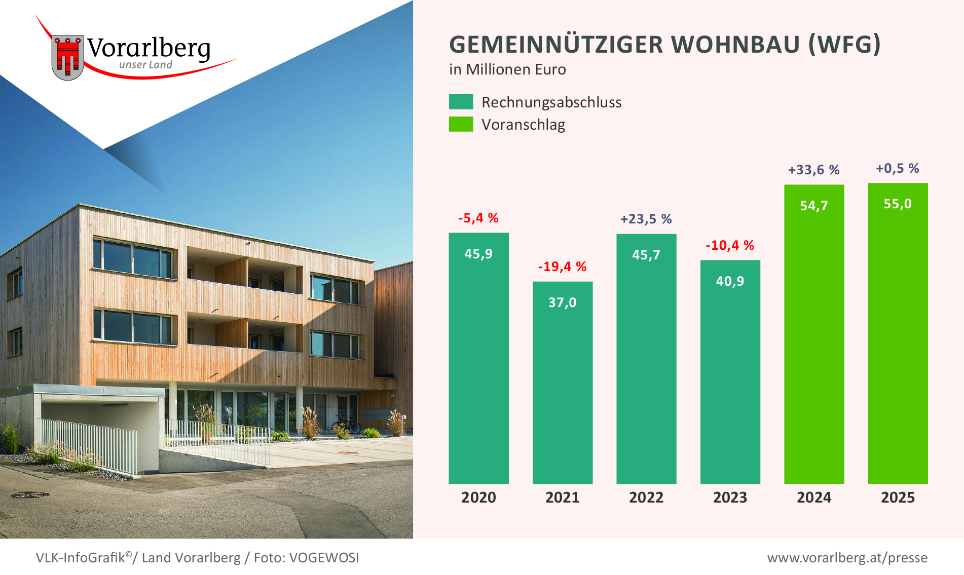 Auch im Bereich Wohnen werden klare Zeichen gesetzt: „Vorarlberg bietet mit seiner Wohnbauförderung die attraktivsten Möglichkeiten, insbesondere für Jungfamilien. Zusätzlich investieren wir gezielt in den gemeinnützigen Wohnbau und entlasten durch die Wohnbeihilfe jene, die Unterstützung brauchen“, führt der Landeshauptmann aus. Dies schaffe nicht nur Wohnraum, sondern trage auch zur sozialen Stabilität bei. Die Wohnbauförderung (inkl. Wohnbeihilfe) ist für das Budgetjahr 2025 mit 183,8 Millionen Euro veranschlagt. Sowohl die Grundpreise und Baukosten als auch das Zinsniveau am Kapitalmarkt sind weiterhin hoch, demgegenüber steht ein großer Bedarf an günstigem bzw. leistbarem Wohnraum.