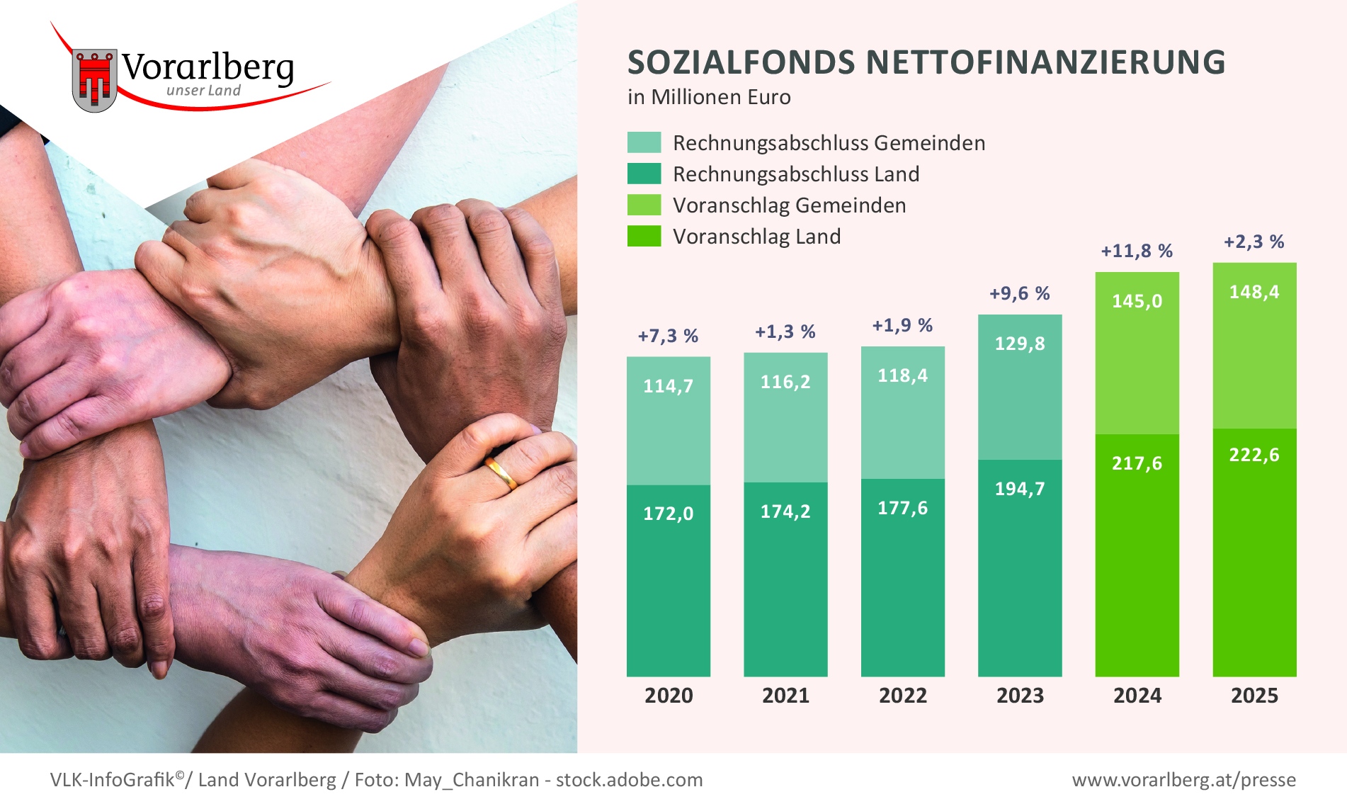 Der mit Abstand größte Anteil am Sozialbudget entfällt wieder auf den Beitrag des Landes zum Sozialfonds. Dieser beträgt 222,6 Millionen Euro, weitere 148,4 Millionen Euro steuern die Gemeinden bei. Somit steigt die Dotierung des Fonds gegenüber dem laufenden Jahr um 2,3 Prozent.
