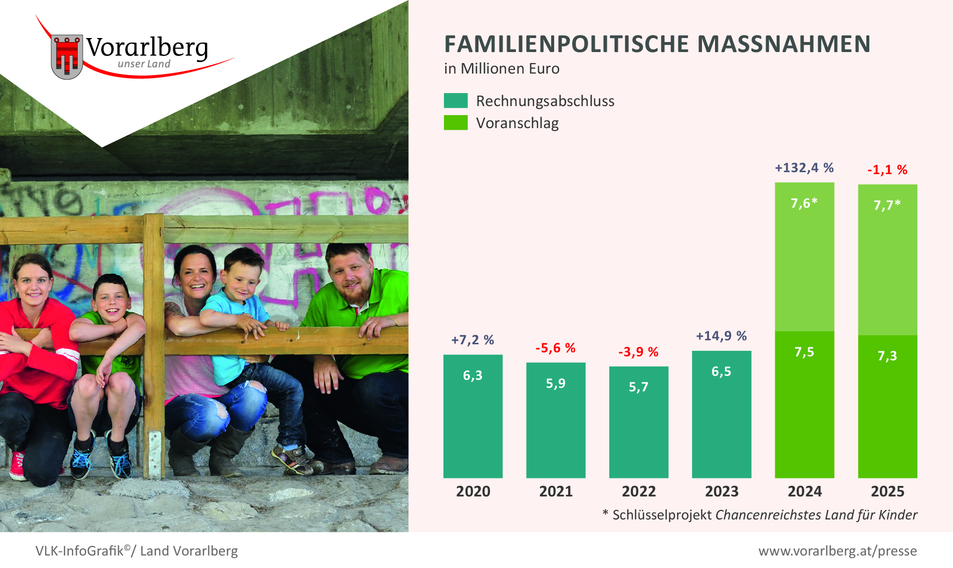 Die Mittel für Familienförderung bzw. familienpolitische Maßnahmen (ohne Kinder- und Schülerbetreuung) bleiben weiter hoch und inkludieren das Schlüsselprojekt „Chancenreichstes für Kinder“ der Marke Vorarlberg: Im Voranschlag 2025 sind 15 Millionen Euro veranschlagt.