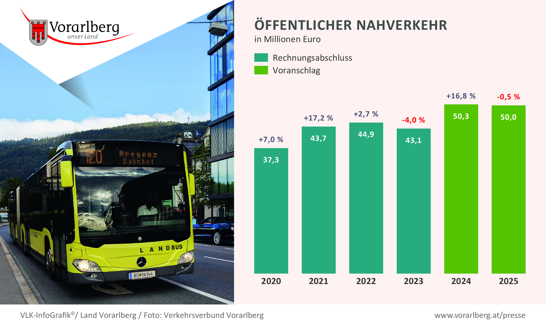 Der Ausbau des Öffentlichen Verkehr wird weiter vorangetrieben. Die Ausgaben dafür wurden in den letzten Jahren kontinuierlich gesteigert und bleiben auch 2025 auf einem hohen Niveau. Im Landesbudget sind für den ÖPNV über 50 Millionen Euro vorgesehen. Davon entfällt rund die Hälfte, nämlich 24,7 Millionen Euro, auf den Schienenverkehr. 15,2 Millionen Euro (ein Plus von fast zehn Prozent) sind Beiträge an Gemeinden und Gemeindeverbände für kommunale und regionale Nahverkehrsvorhaben. Mit 4,2 Millionen Euro wird der Verkehrsverbund Vorarlberg unterstützt.