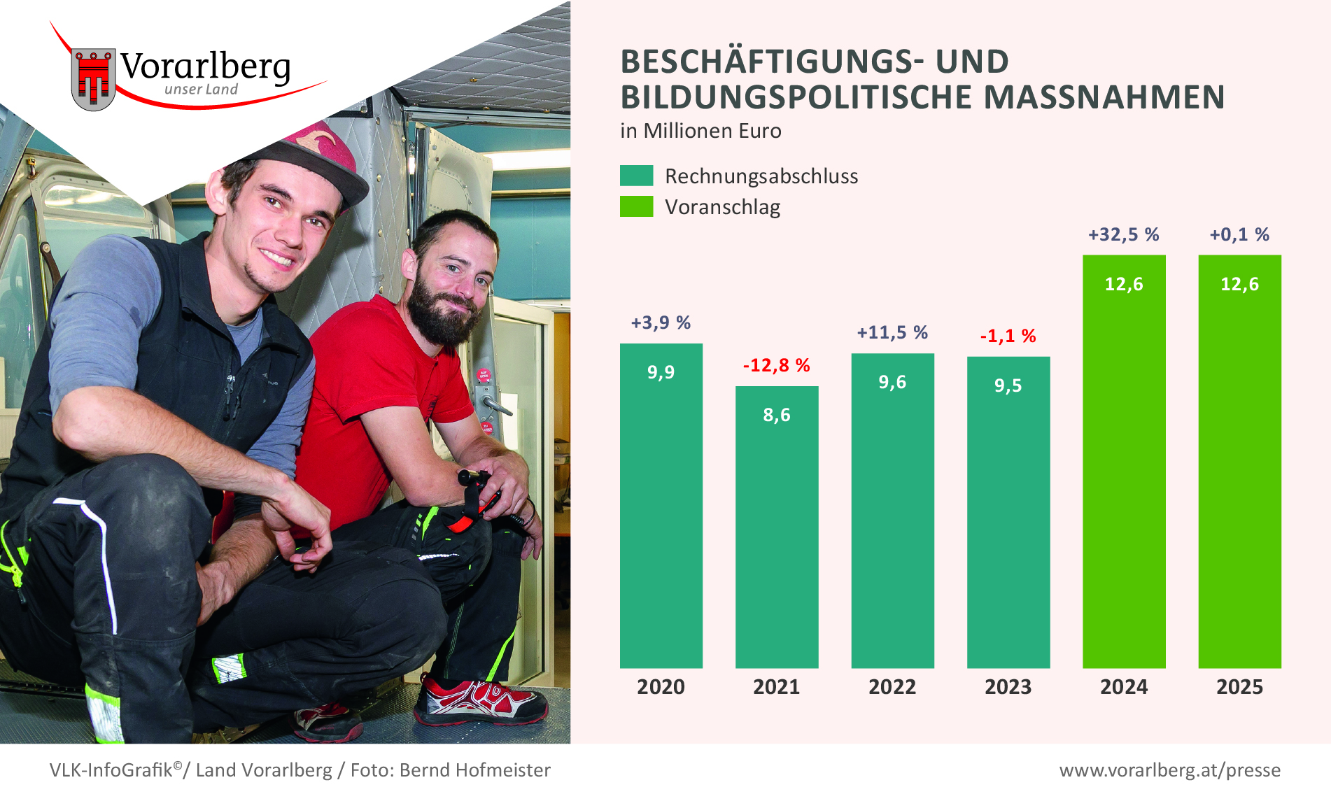Angesichts der schwächelnden Konjunktur verlangen die Bekämpfung von Langzeitarbeitslosigkeit und auf die Förderung der Jugendbeschäftigung weiterhin besonderes Augenmerk. Daher ist klar, dass bei den Investitionen für beschäftigungs- und bildungspolitische Maßnahmen das hohe Niveau gehalten werden muss. Im Landesvoranschlag 2025 sind dafür 12,6 Millionen Euro vorgesehen, gleich viel wie im laufenden Haushalt.