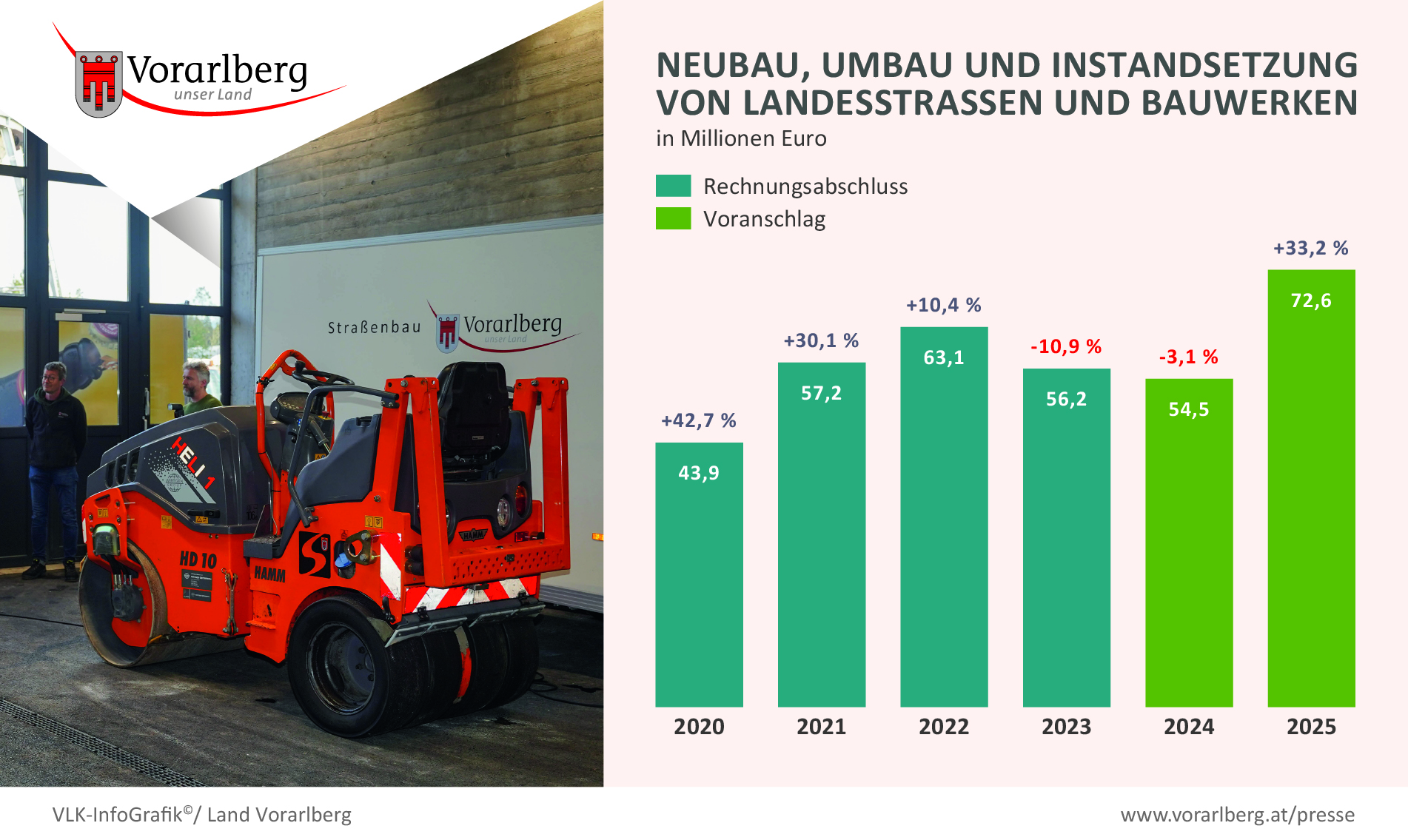 Der Landesstraßenbau ist im Voranschlagsentwurf 2025 des Landes Vorarlberg mit insgesamt 111,0 Millionen Euro dotiert (ohne Personalkosten). 23,6 Millionen Euro entfallen auf die Instandhaltung des Landesstraßennetzes, 72,6 Millionen Euro fließen in den Bau von Landesstraßen und Bauwerken (inkl. Projektierung und Kauf von Grundstücken) sowie in Maßnahmen zur Erhöhung der Verkehrssicherheit. 8,2 Millionen werden in den Radverkehr investiert. Beim größten Projekt, dem Stadttunnel Feldkirch, wird 2025 mit dem Hauptbaulos begonnen, dafür sind 29 Millionen Euro vorgesehen.
