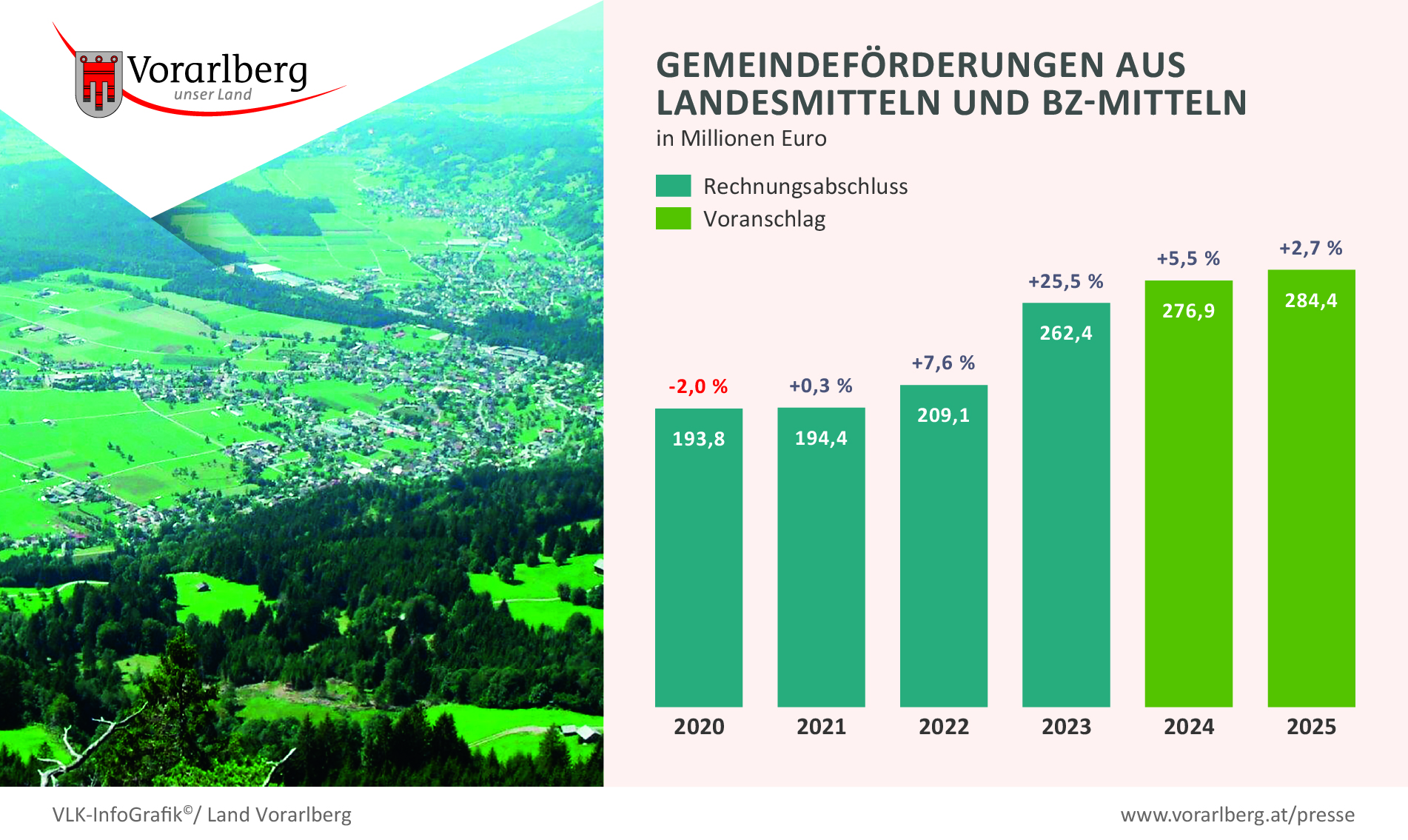 Die Transferleistungen an die Vorarlberger Gemeinden steigen erneut: 2025 wurde die Rekordsumme von 333,2 Millionen Euro veranschlagt – das ist ein Plus von mehr als sechs Prozent. Das ergibt sich vor allem durch die Aufstockung der Gemeindeförderungen aus Landesmitteln. Dieser Anteil beträgt 195,3 Millionen, rund 14 Millionen mehr als im Vorjahr. Weitere 89 Millionen Euro sind Bedarfszuweisungen an die Gemeinden – zusammen macht das über 284 Millionen Euro. Die 96 Vorarlberger Gemeinden tragen mit ihren Investitionen entscheidend zur Qualität von Kinderbetreuung, Bildung, Gesundheit oder Sozialer Wohlfahrt im Lande bei. Weil diese Aufgaben für die zukünftige Entwicklung Vorarlbergs von zentraler Bedeutung sind, pflegen Land und Gemeinden eine enge Zusammenarbeit, um die Finanzierung wichtiger Projekte gemeinsam sicherzustellen. Diese starke Partnerschaft wird im Landesvoranschlag 2025 einmal mehr untermauert.
