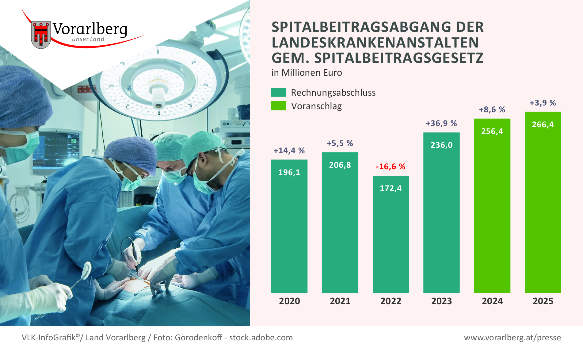 Der Voranschlag der Krankenhausbetriebsgesellschaft (KHBG) für das Wirtschaftsjahr 2025 einen Spitalsbeitragsabgang für die Landeskrankenanstalten in Höhe von 266,4 Millionen Euro vor. Das ist eine Steigerung um 3,9 Prozent, die im Wesentlichen durch die steigenden Personalkosten der KHBG begründet ist.