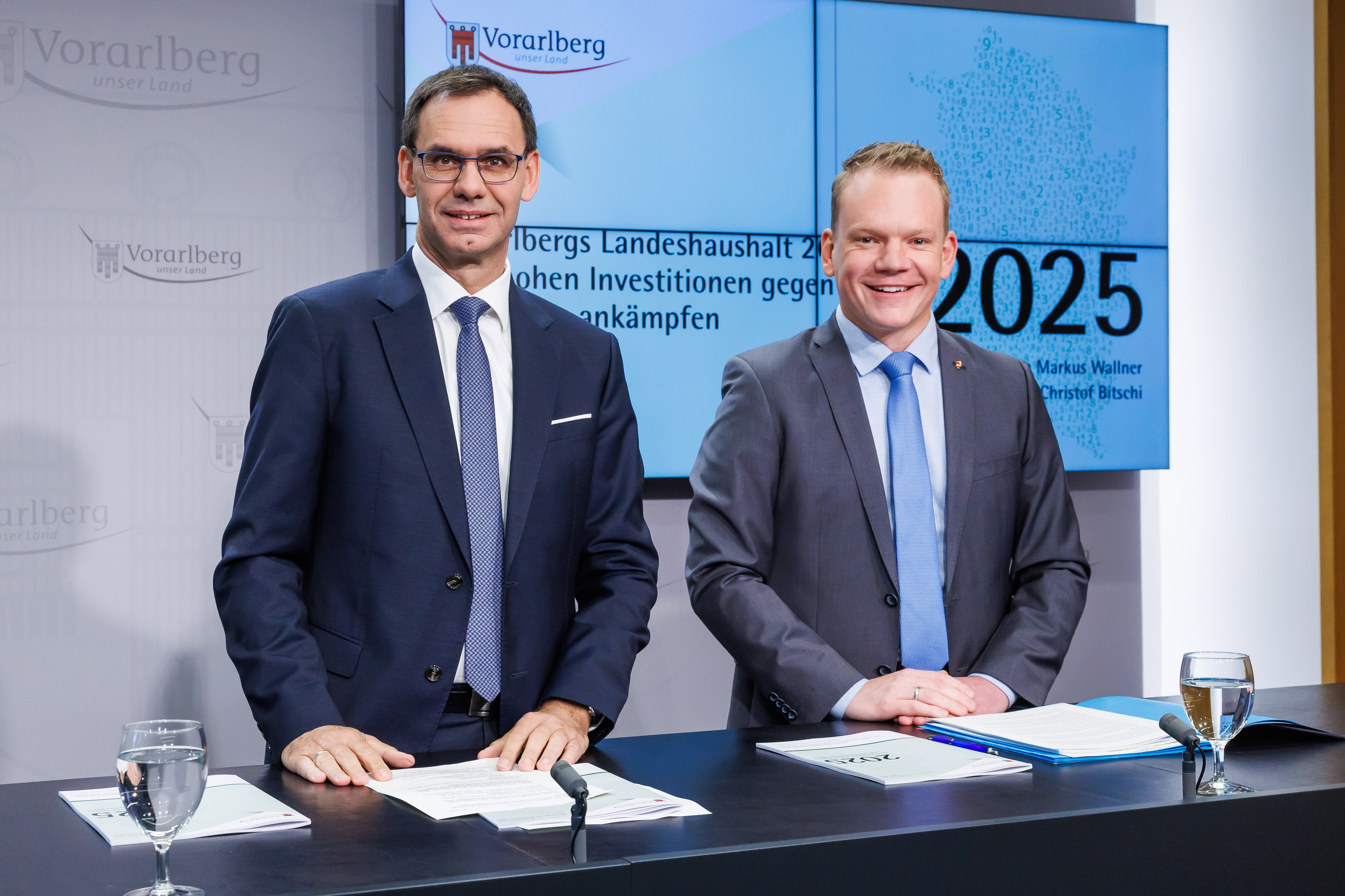„Den Landeshaushalt langfristig konsolidieren, in Zukunftsprojekte investieren“, bringen Landeshauptmann Markus Wallner und Landesstatthalter Christof Bitschi die Stoßrichtung der Budgetpolitik für die beginnende Periode heute (19. November) auf den Punkt. Mit hohen Investitionen in Zukunftsprojekte soll die Rezession bekämpft werden, gleichzeitig wird ein Konsolidierungspfad eingeleitet, der strukturelle Reformen notwendig macht. Insgesamt sollen im kommenden Jahr 2,617 Milliarden Euro aufgewendet werden. Im Zentrum stehen Investitionen in die Bildung, den sozialen Zusammenhalt und die Infrastruktur.