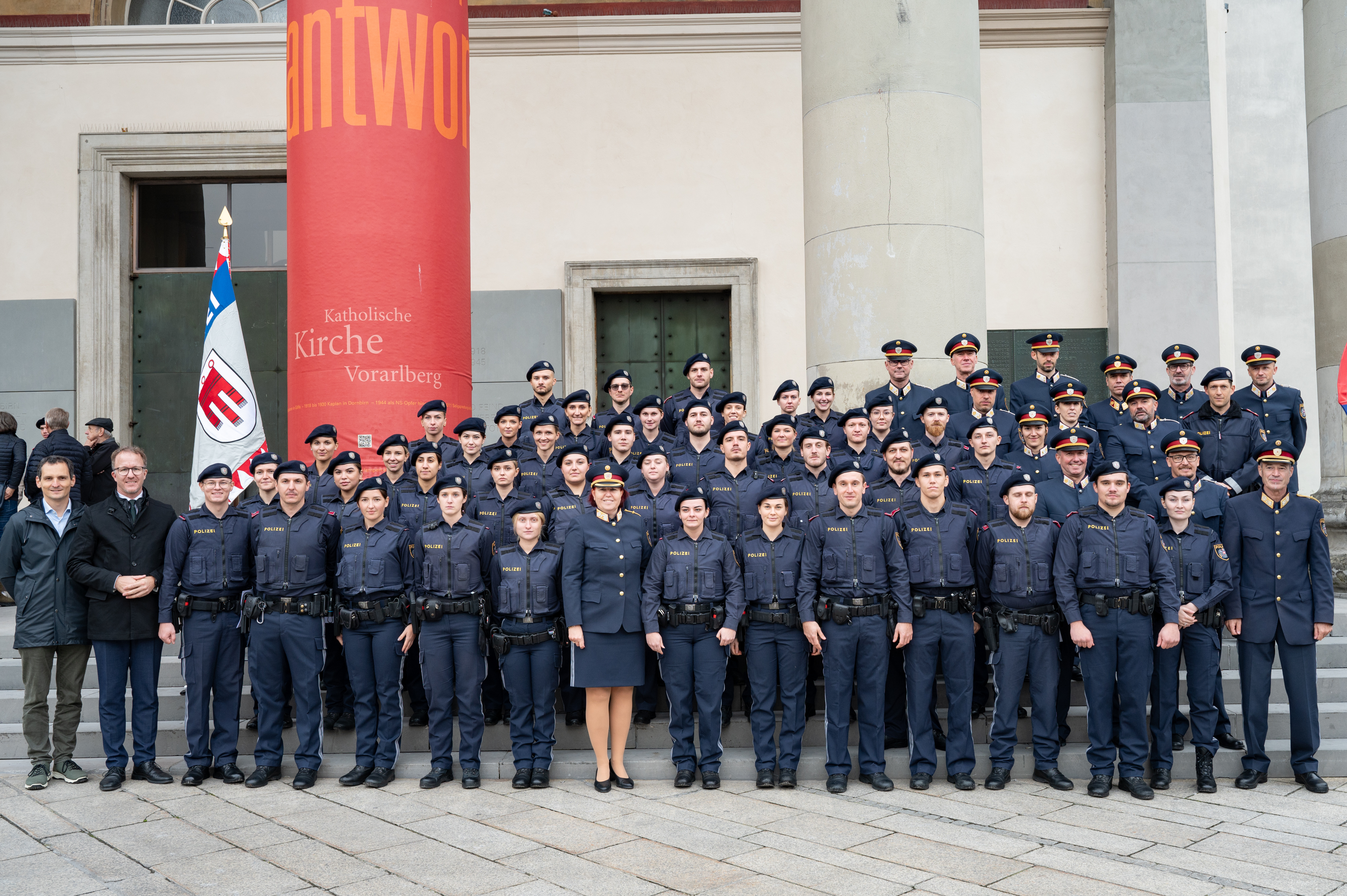 Der Festakt markiert einen besonderen Meilenstein für die PolizeischülerInnen, die am 2. September 2024 ihre Grundausbildung bei der Polizei Vorarlberg begonnen haben und heute feierlich das Treuegelöbnis ablegten. Im Anschluss daran wurden zudem 51 ausgebildete PolizeibeamtInnen zu InspektorInnen ernannt und erhielten ihre Ernennungsdekrete. Mit dem Erhalt des Dienstgrades „InspektorIn“ treten die PolizeibeamtInnen offiziell in den Dienst der Exekutive.