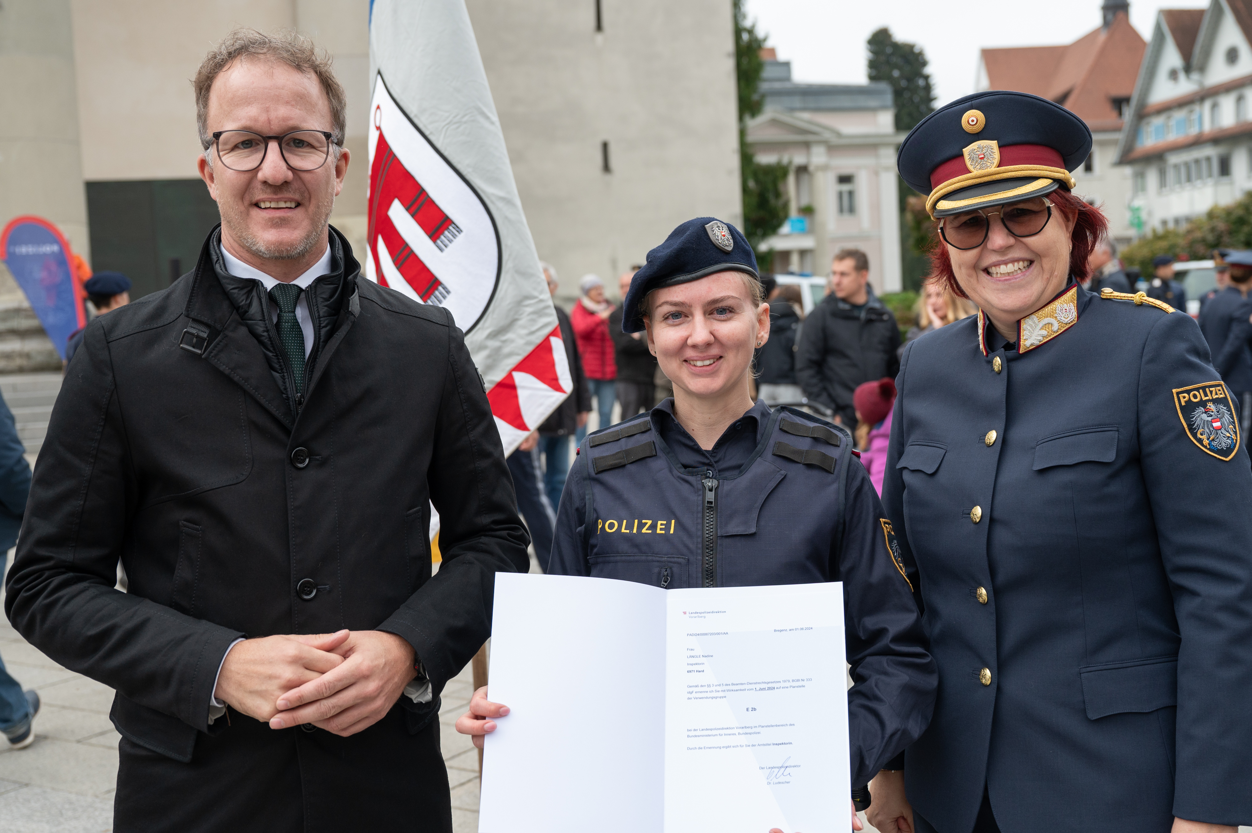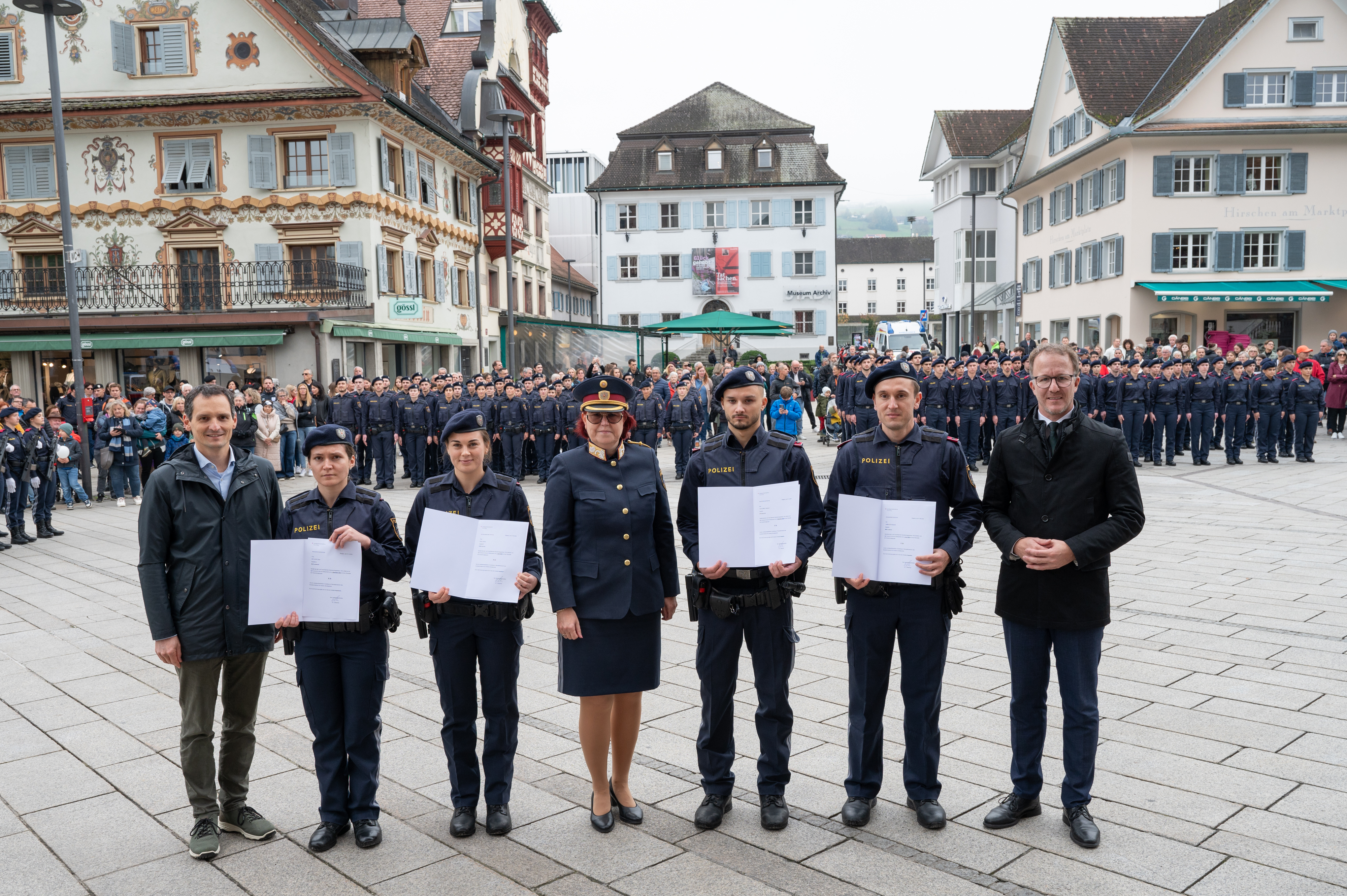 Gantner gratulierte den frisch angelobten bzw. ernannten PolizistInnen und begrüßte den öffentlichen Festakt in Dornbirn als starkes Zeichen der Bürgernähe: „Unsere Polizei leistet erfolgreiche Sicherheitsarbeit und genießt dafür zu Recht hohes Ansehen und Vertrauen bei den Menschen im Lande. Die heutige Veranstaltung bietet die Gelegenheit, einen Einblick in die Polizeiarbeit und ihre künftige Entwicklung zu geben und damit auch die enge Verbindung der Polizei zur Bevölkerung weiter zu stärken.“