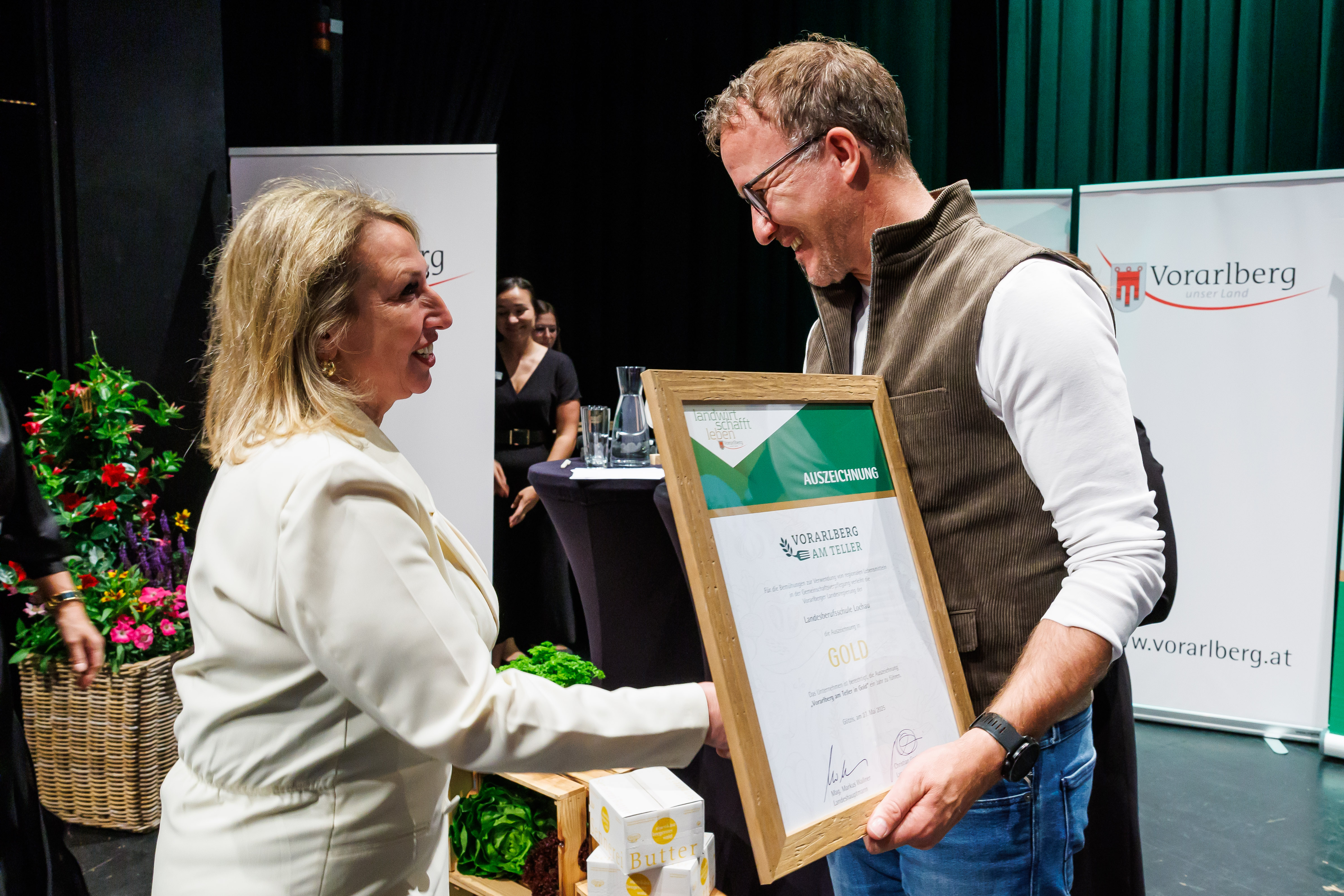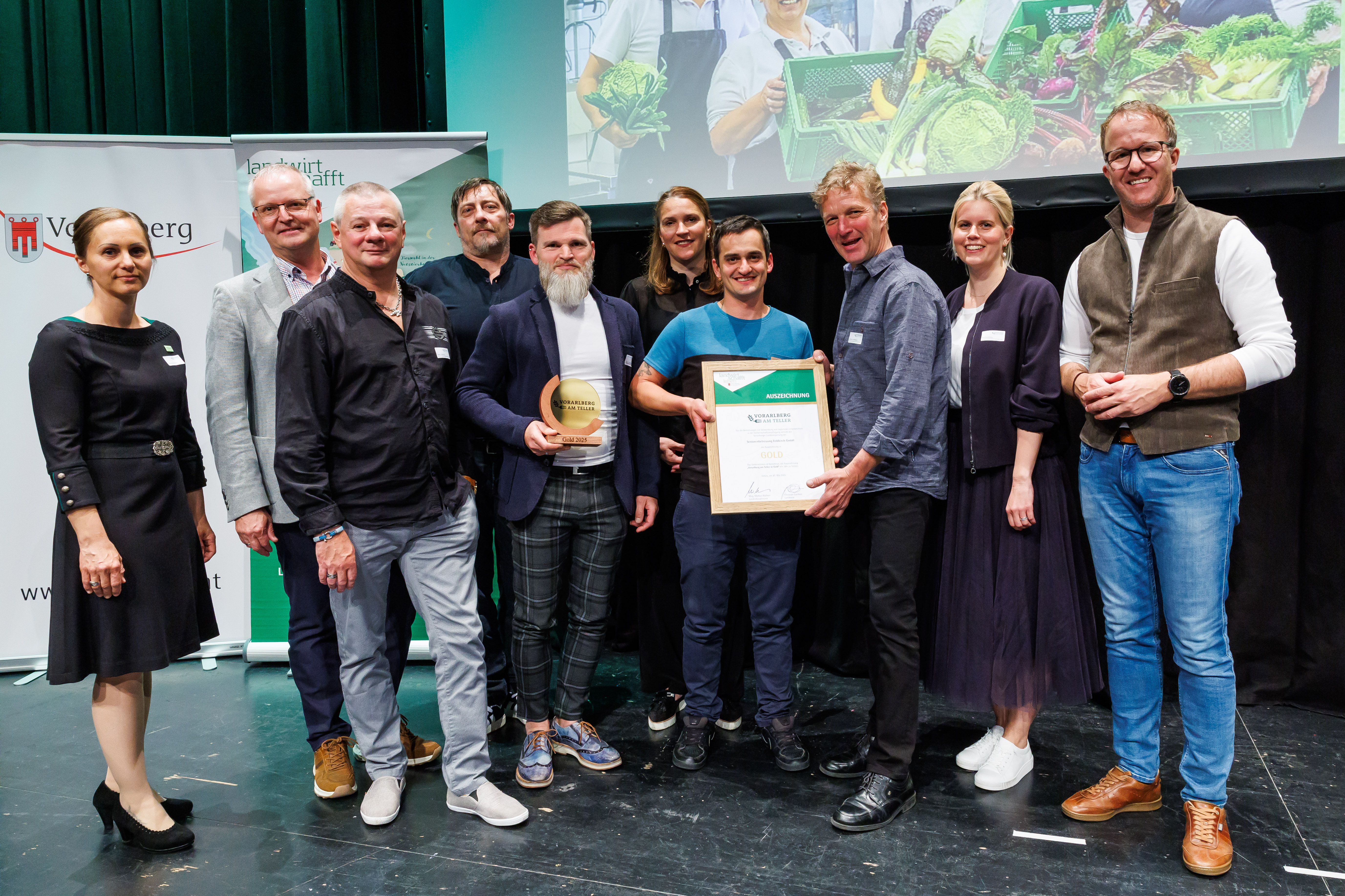 Götzis (VLK) – Im Rahmen eines Festaktes am Dienstag (27. Mai), wurden in der Kulturbühne Ambach in Götzis 45 Gemeinschaftsküchen für ihren konsequenten Einsatz regionaler Lebensmittel ausgezeichnet. Rund 230 geladene Gäste feierten gemeinsam mit den Verantwortlichen der Initiative „Vorarlberg am Teller“ die beeindruckende Leistung von über 550 Mitarbeitenden, die im vergangenen Jahr mehr als fünf Millionen Mahlzeiten aus überwiegend heimischen Zutaten zubereitet haben. Im Zentrum der Veranstaltung standen die starken Partnerschaften zwischen Gemeinschaftsküchen und der Vorarlberger Landwirtschaft. Landesrat Christian Gantner und Landesbäuerin Esther Bitschnau überreichten die Urkunden als sichtbares Zeichen der Anerkennung für gelebte Regionalität, nachhaltige Versorgung und ein starkes Miteinander.